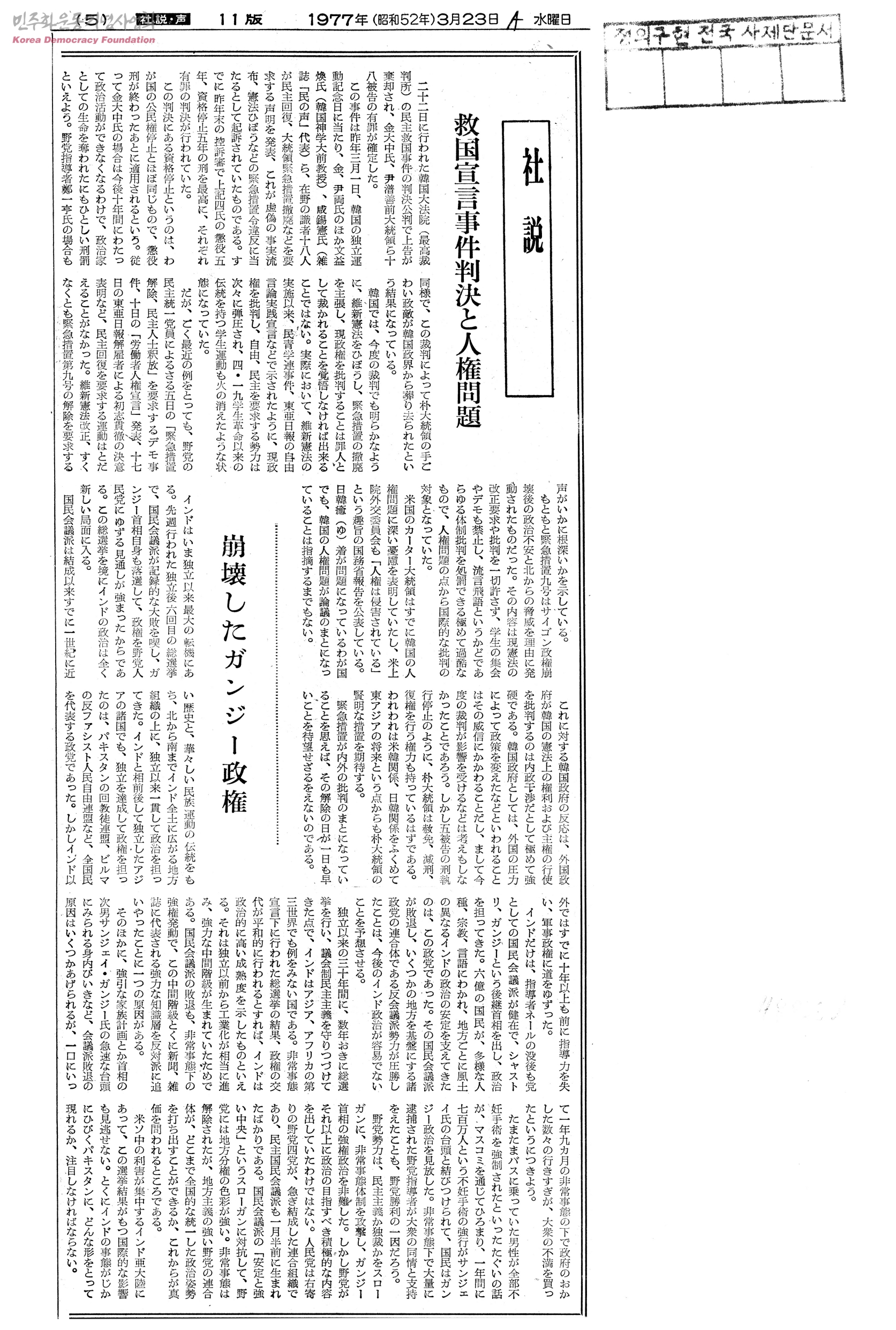 [신문스크랩]救國宣言事件判決と人權問題