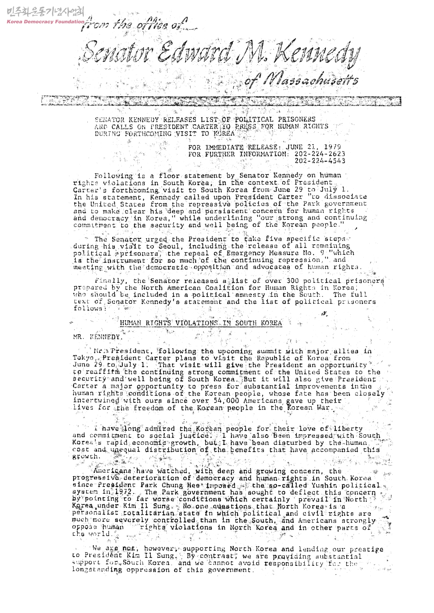 SENATOR KENNEDY RELEASES OF POLITICAL PRISONERS AND CALLS ON PRESIDENT CARTER TO PRESS FOR HUMAN RIGHTS DURING FORTHCOMING VISIT TO KOREA[원본]