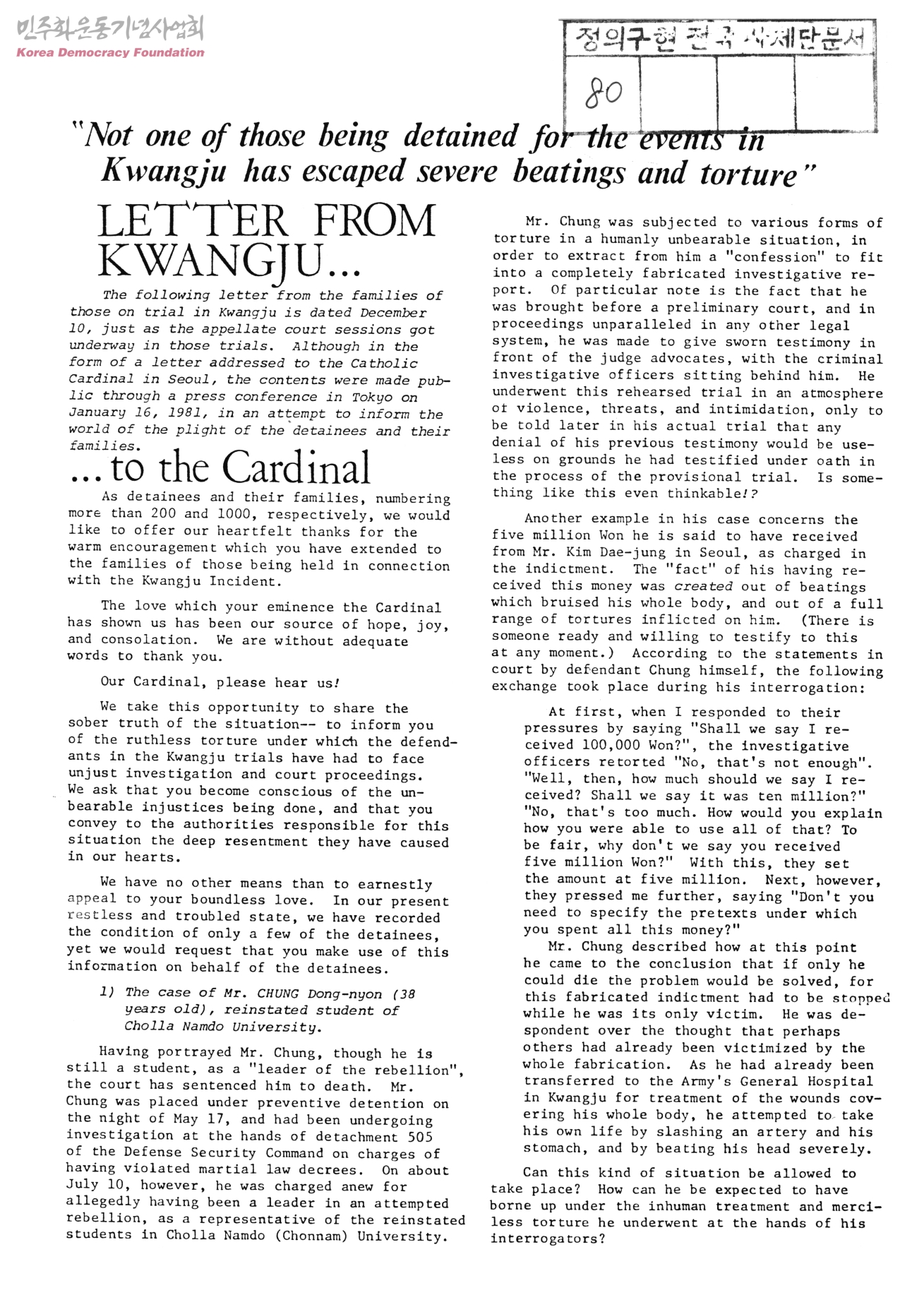 "Not one of those being detained for the events in Kwangju has escaped severe beatings and torture"