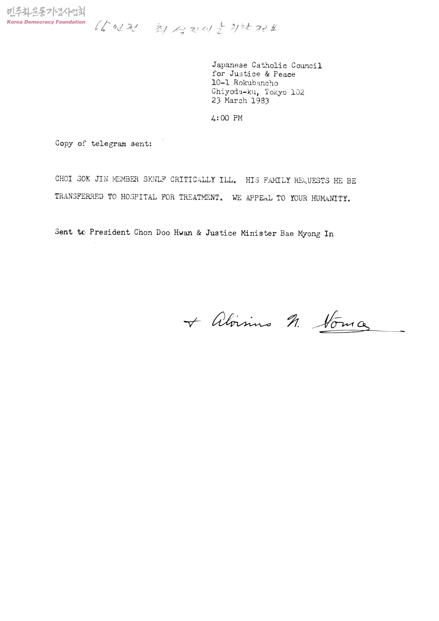 [~가 Japanese Catholic Council for Justice & Peace 에 보내는 남민전 관련 수감자 최석진의 병보석을 위해 전두환대통령과 배명인 법무부장관에게 보낼 탄원서 문구]