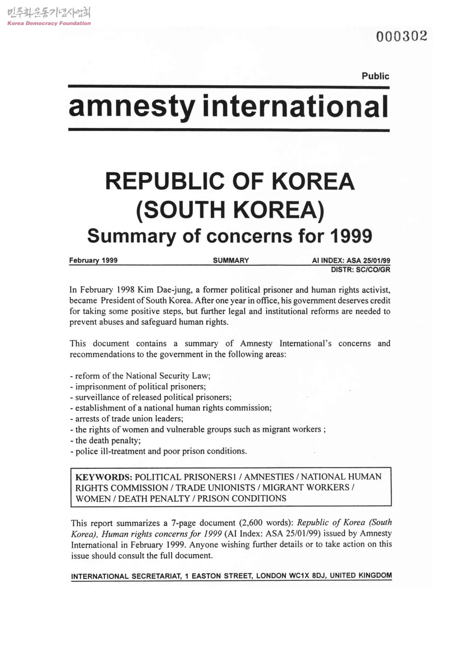 Republic of Korea: Summary of concerns for 1999