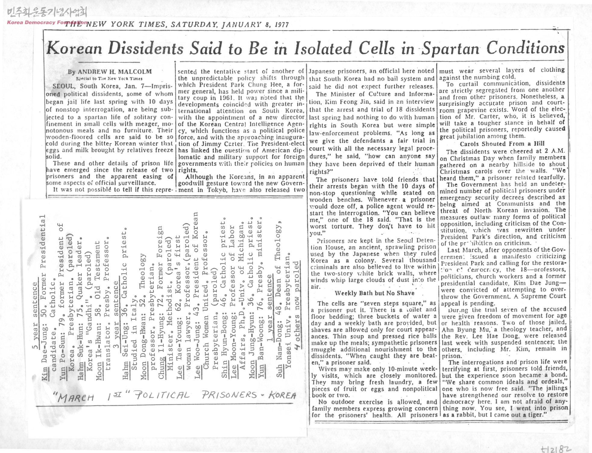 - 한국의 구속된 정치범들의 열악한 생활환경에 대해 고발.