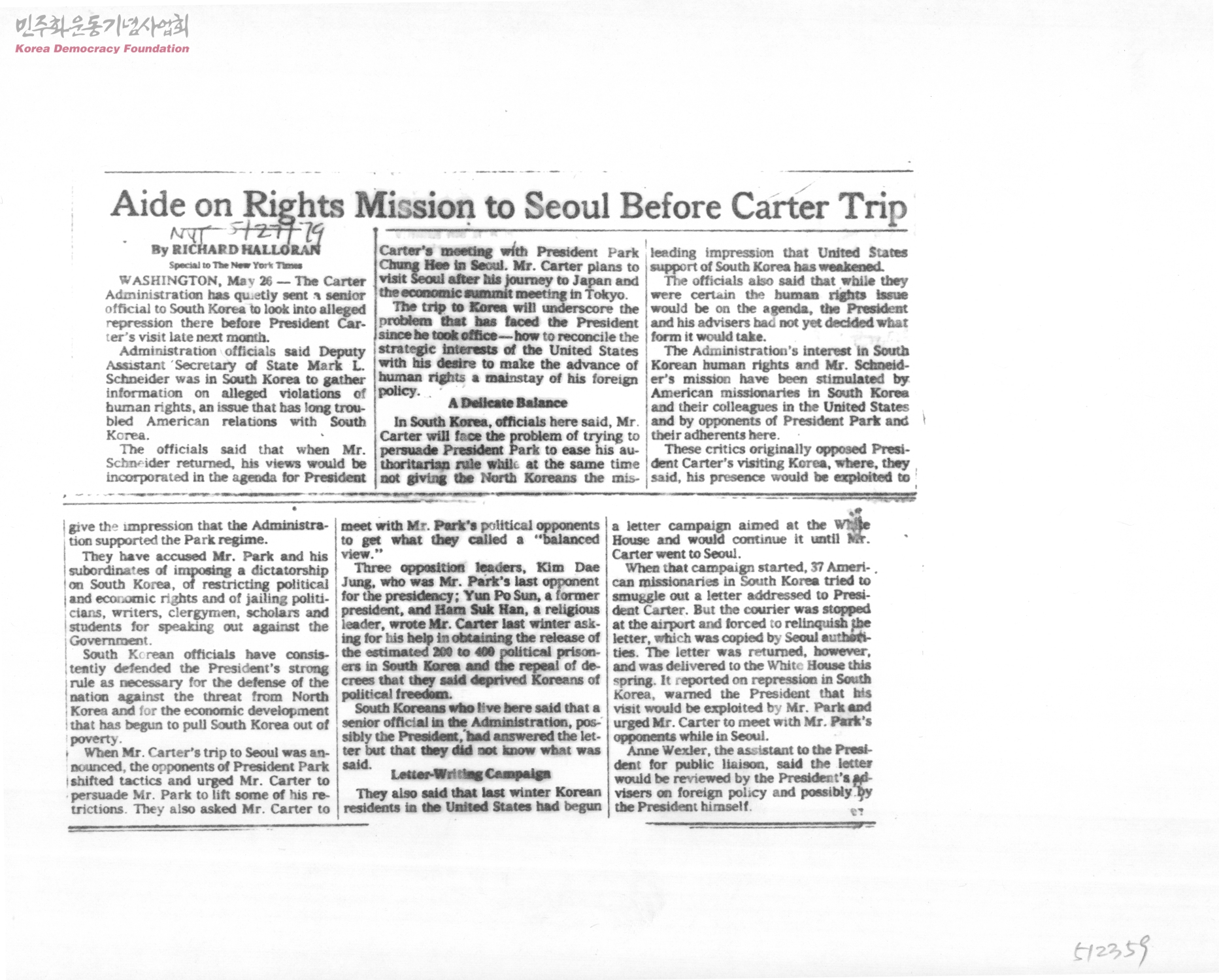 [신문스크랩]Aide on Rights Mission to Seoul Before Carter Trip 관련 기사