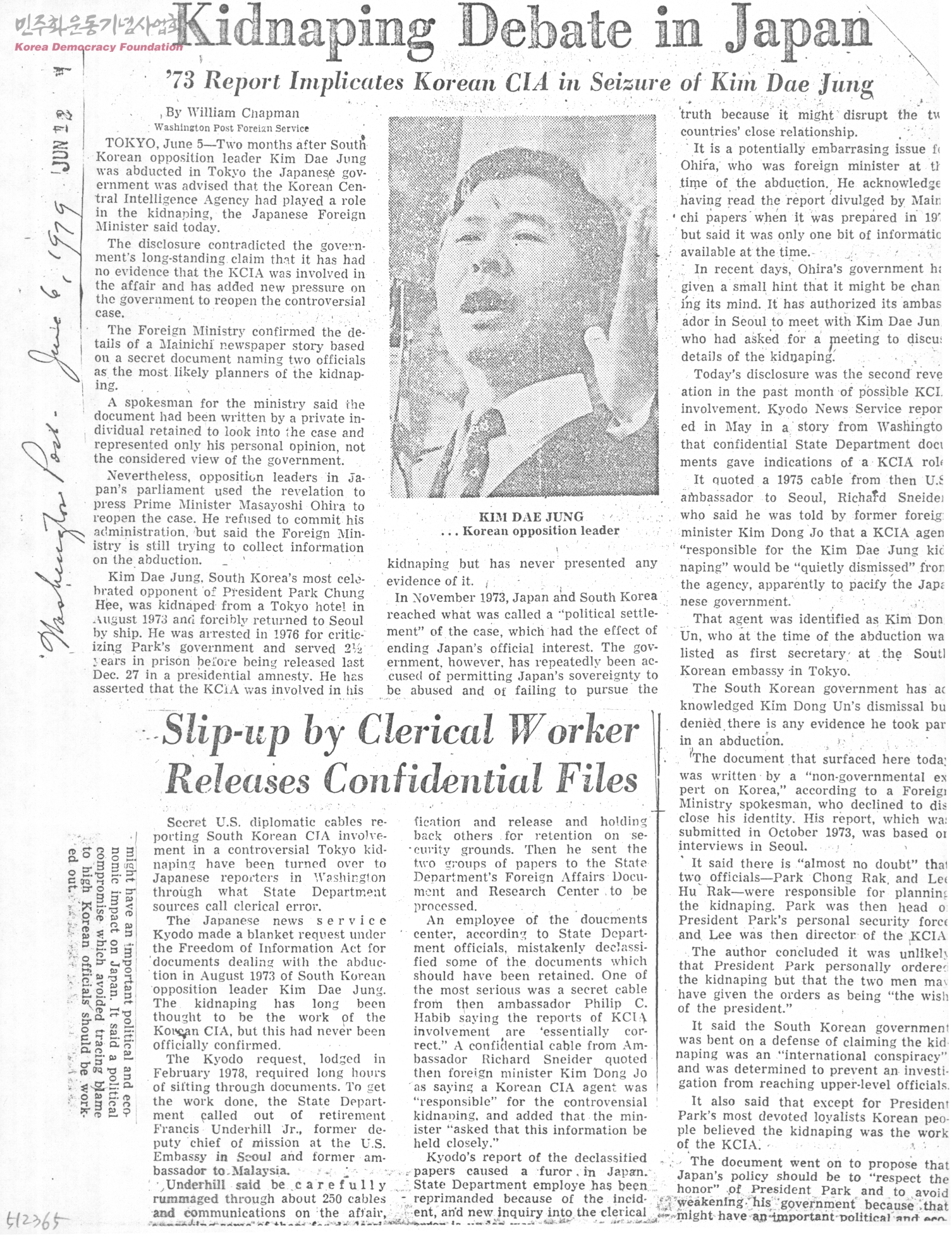 - '73 Report Implicates Korean CIA in Seizure of Kim Dae Jung 김영삼 신민당 총재 정부 비난-한국 여야당 대립 심각 김대중씨 일시 연행.
