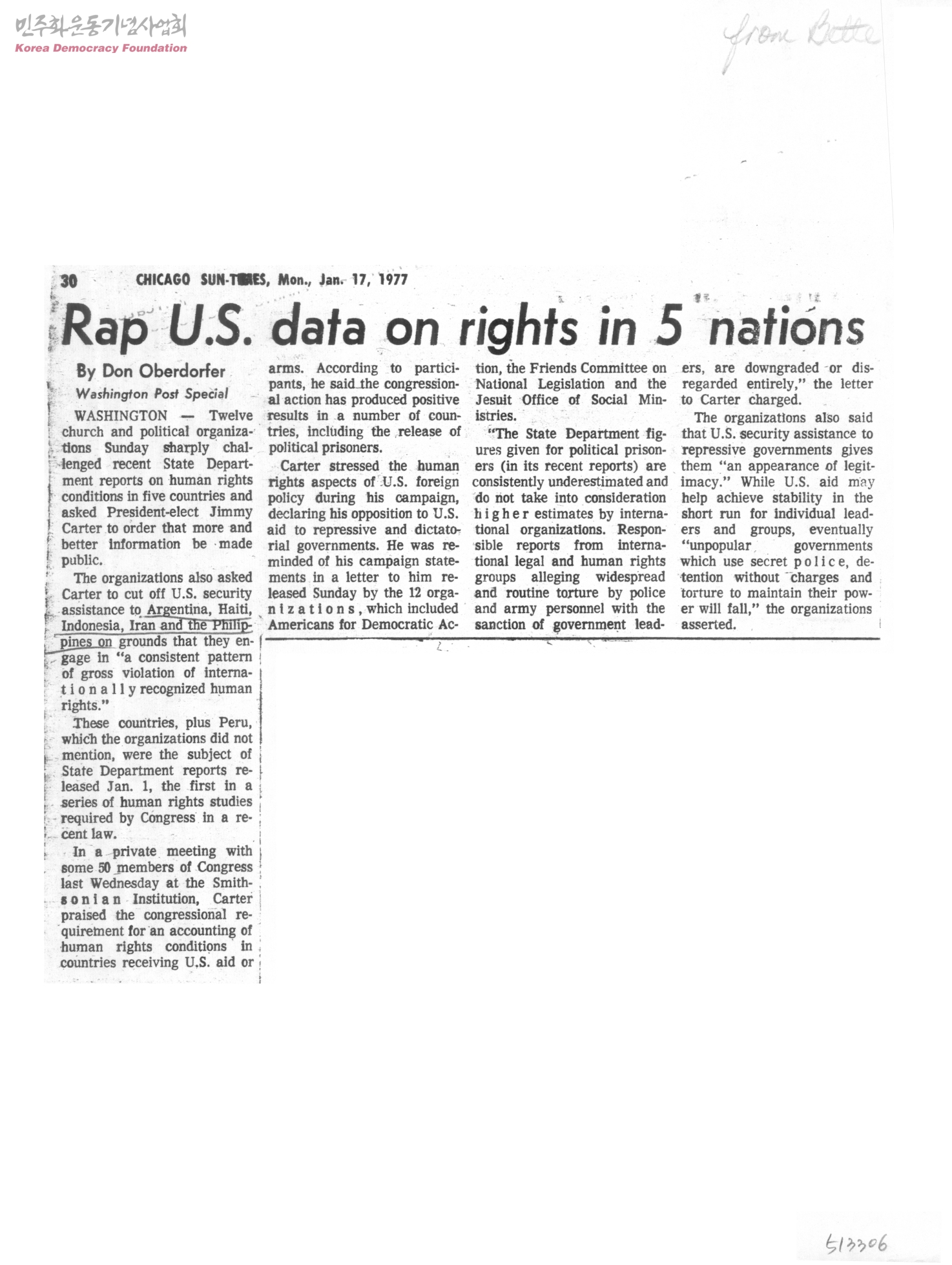 - 아르헨티나, 아이티, 인도네시아, 이란, 필리핀 5개 국가의 인권에 대한 미국 자료를 기독교단체들이 비판했다는 기사
