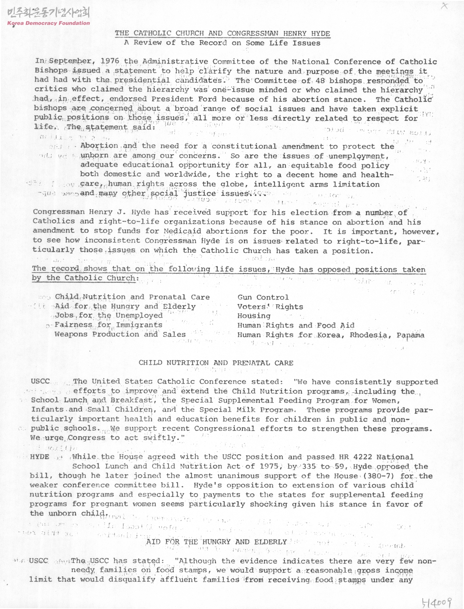 The Catholic Church and Congressman Henry Hyde-A Review of the Record on Some Life Issues