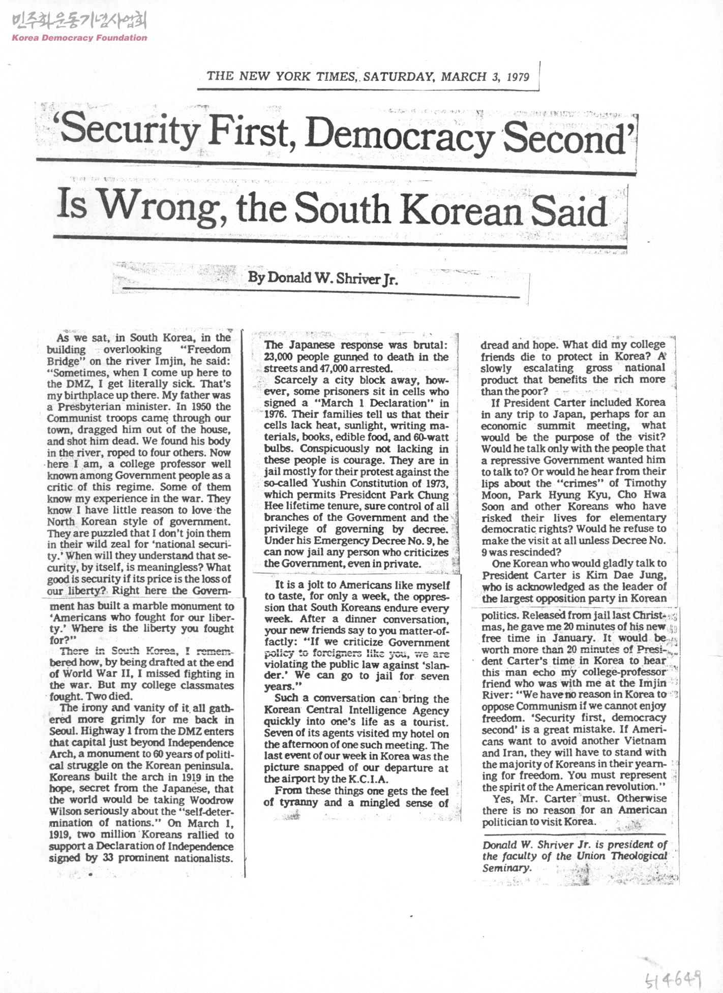 [신문스크랩]'Security First, Democracy Second' Is Wrong, the South Korean Said 관련 기사