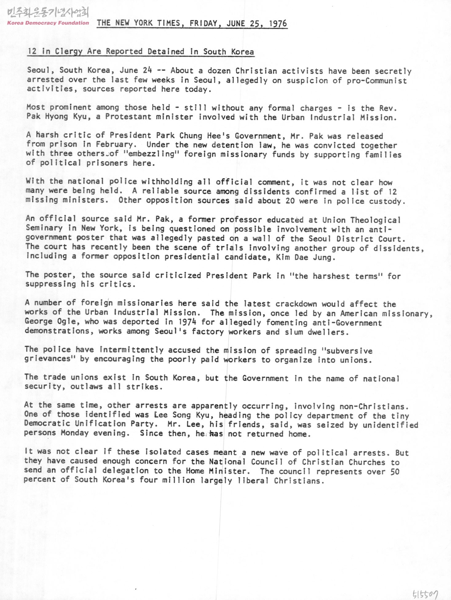 [신문스크랩]12 in Clergy Are Reported Detained in South Korea
