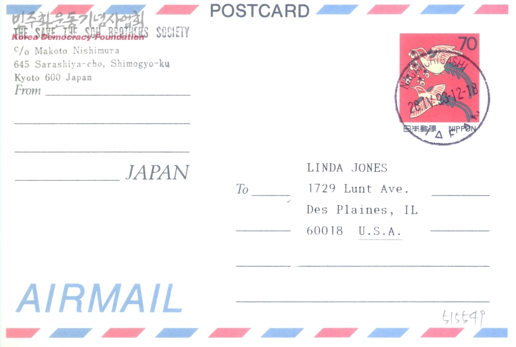 Postcard-The Save the SOH Brothers Society Dissolved[수신:Linda Jones,발신:General Secretary Makoto Nishimura]