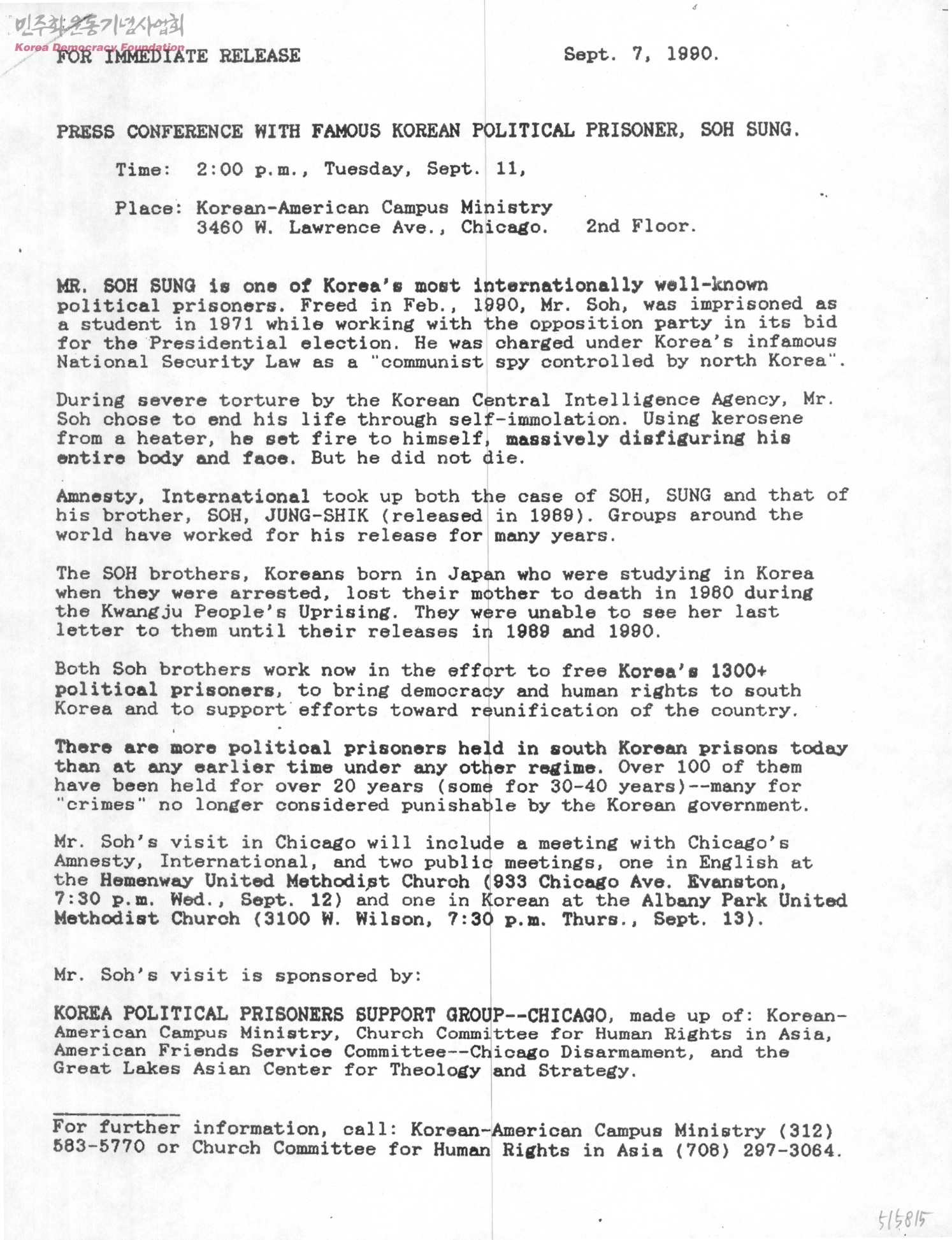 FOR IMMEADITE RELEASE-Press Conference With Famous Korean Political Prisoner, Soh Sung