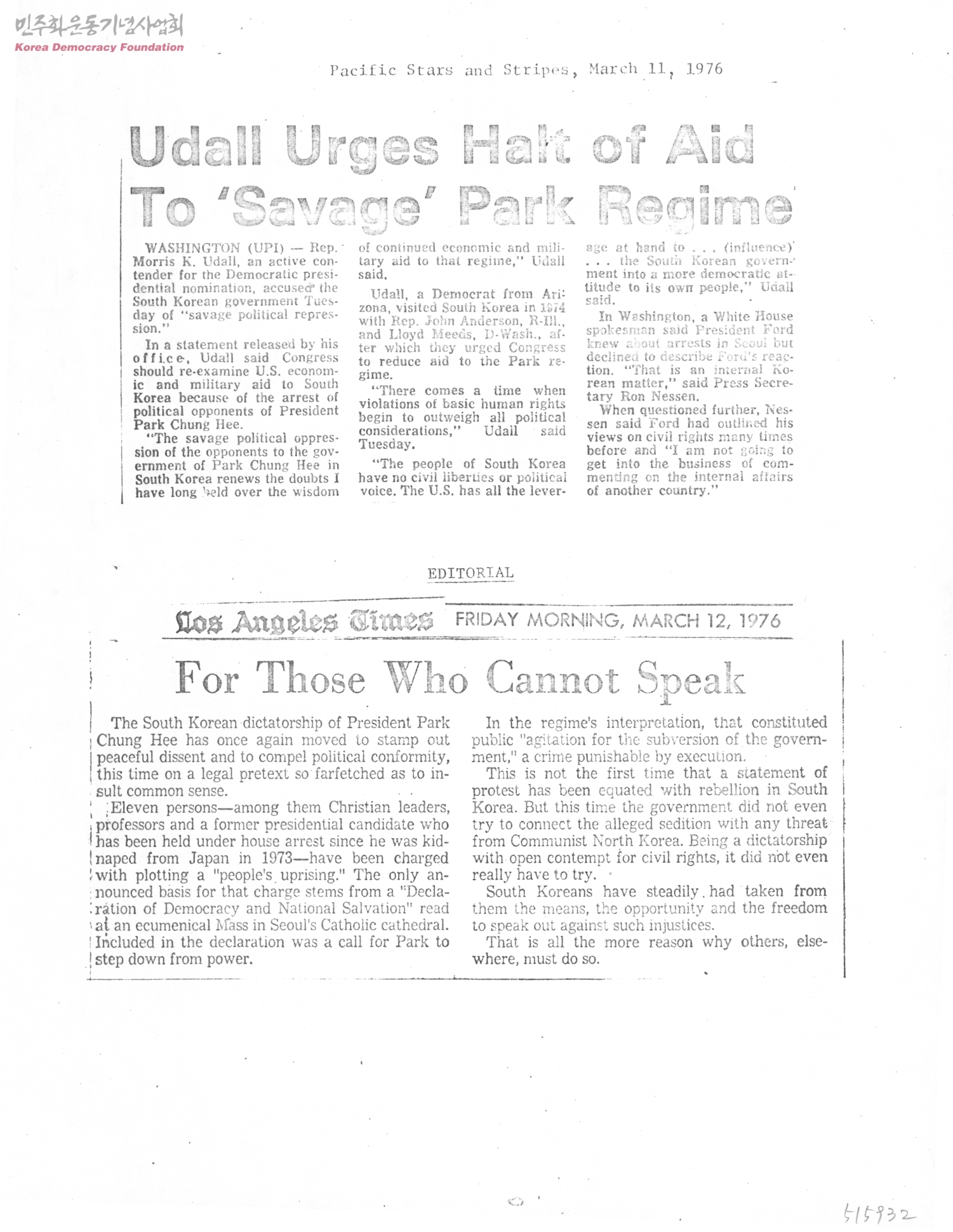 [신문스크랩][Udall Urges Halt of Aid To 'Savage' Park Regime 관련 기사]