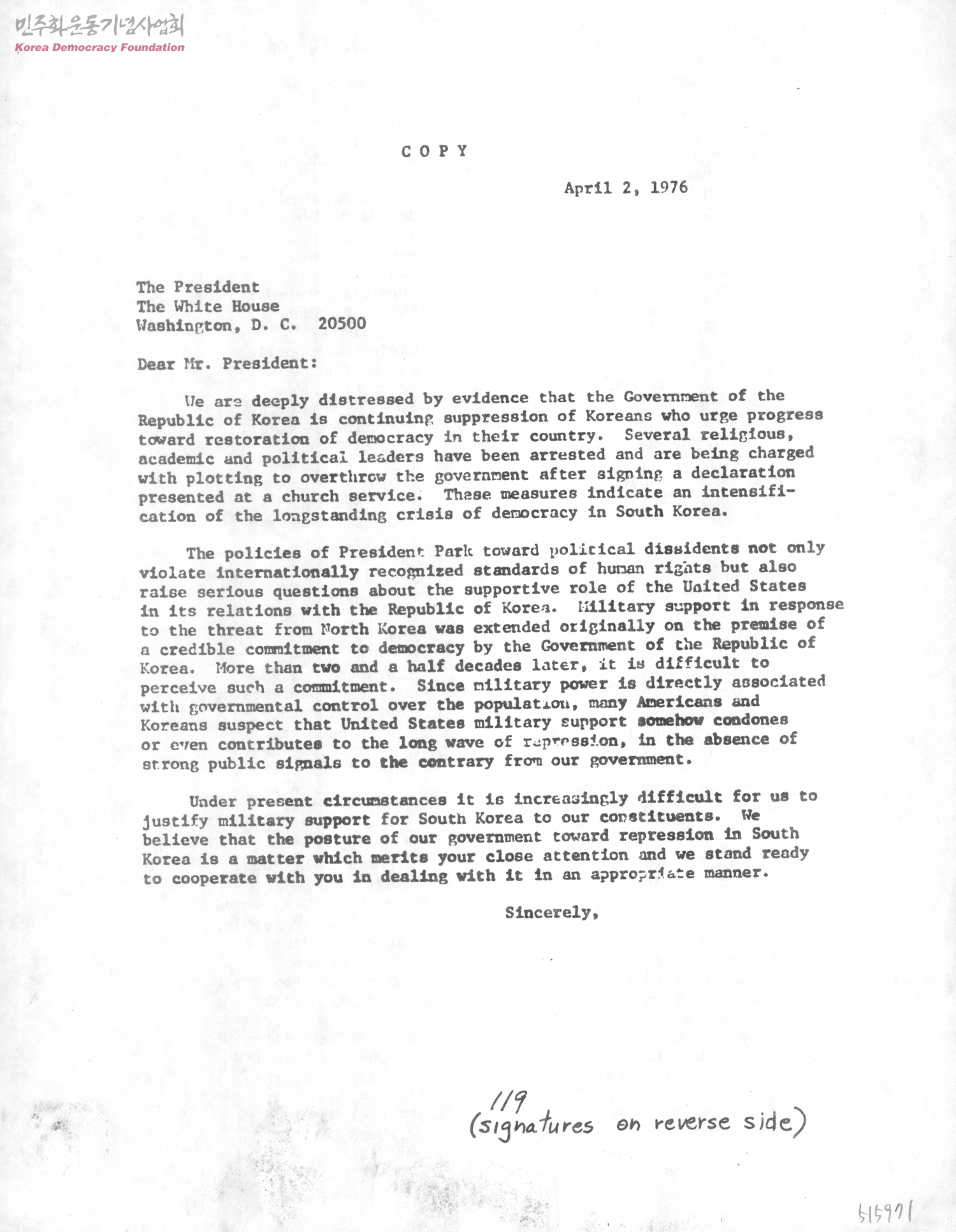 [Bob Carr 등이 미국 대통령에게 제출하는 박정희 정권의 민주화운동 탄압 관련 탄원서]