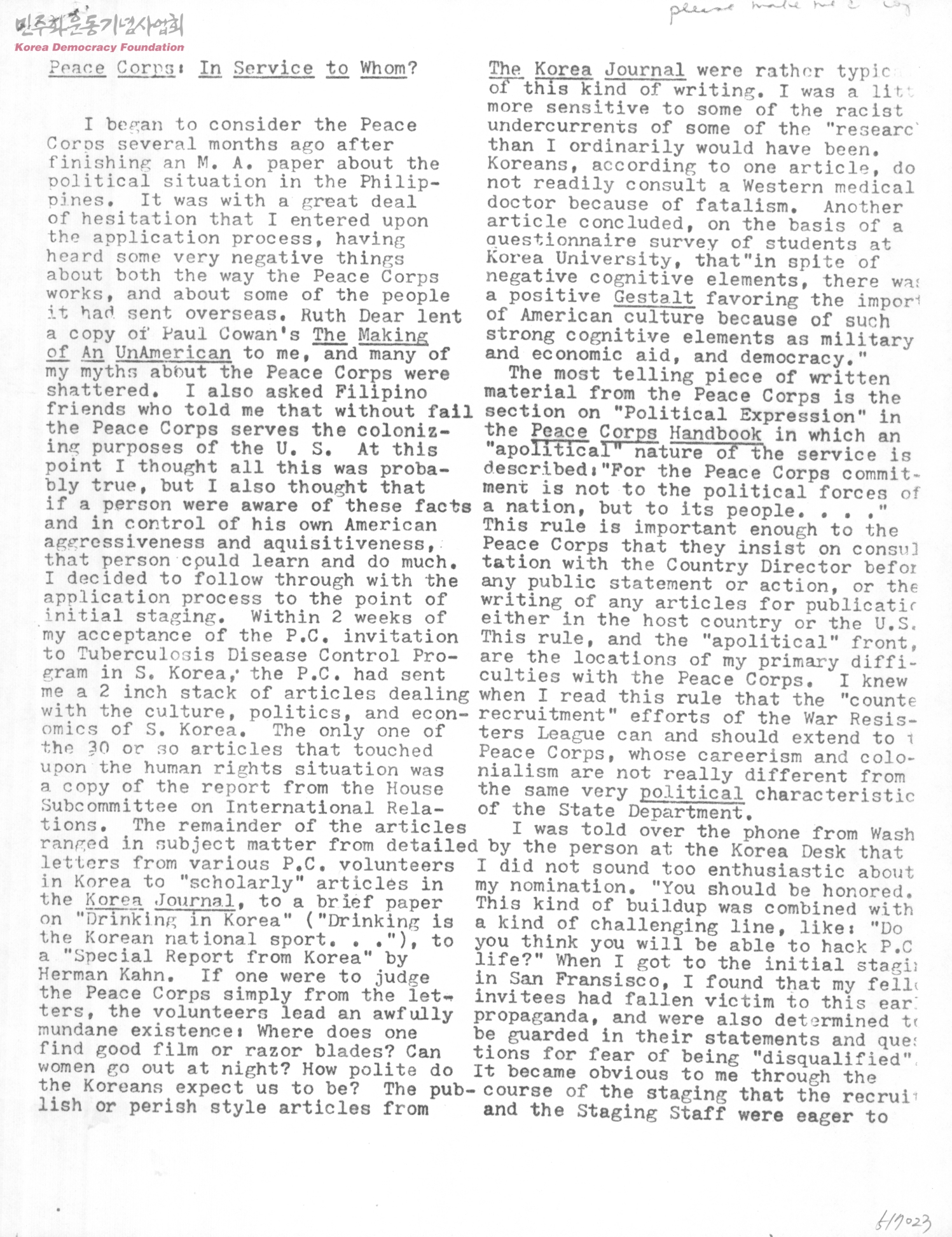 - The reminder of the articles ranged in subject matter from detailed letter form various P.C. voluteers in Korea to "scholarly" articles in the Korea Journal,to a brief paper on "Drinking in Korea"("Drinking ins the the Korean national sport..."),to a "Special Report from Korea" by Herman Karn.