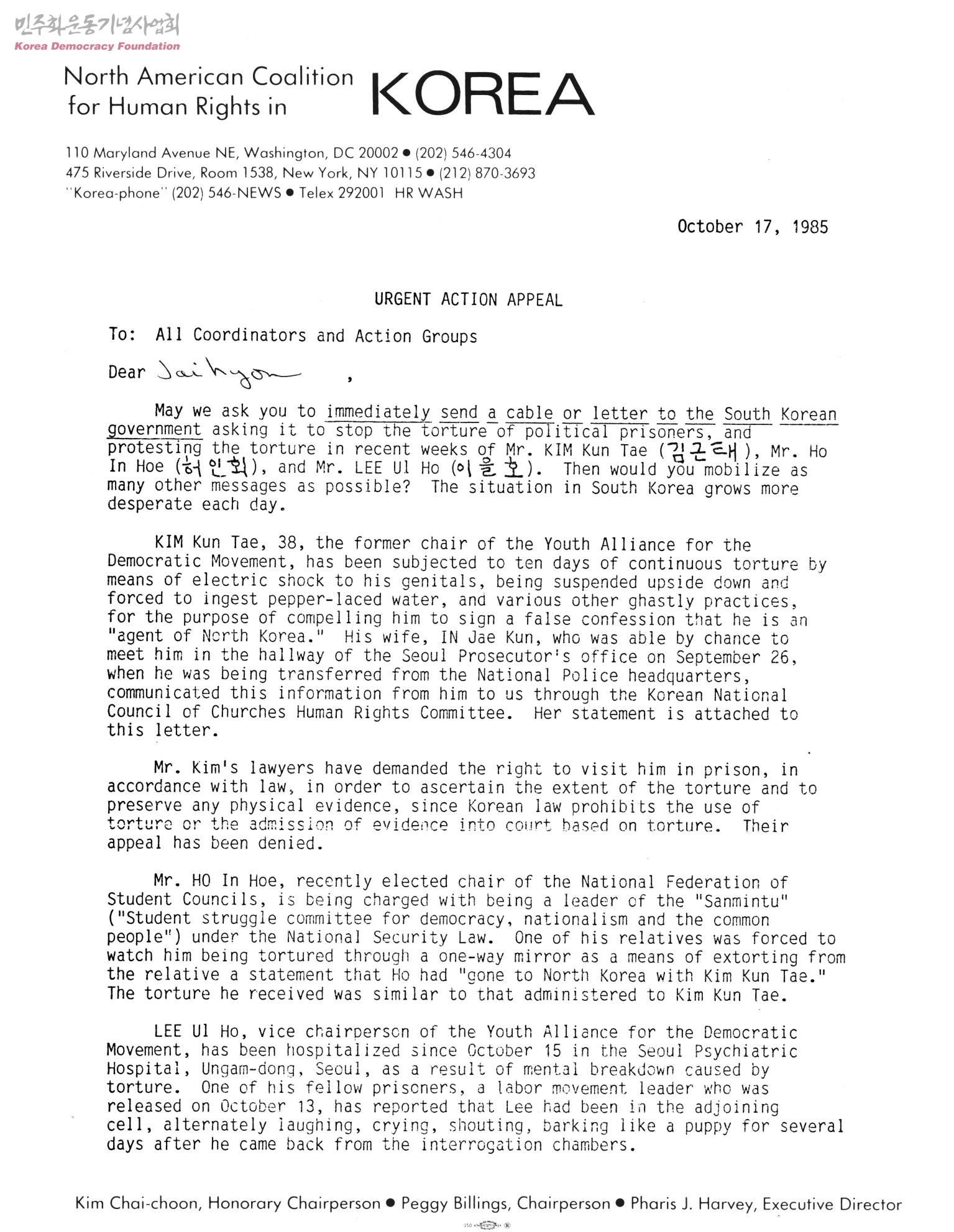 Urgent Action Appeal[김근태, 허인회, 이을호 관련 도움 요청 글]