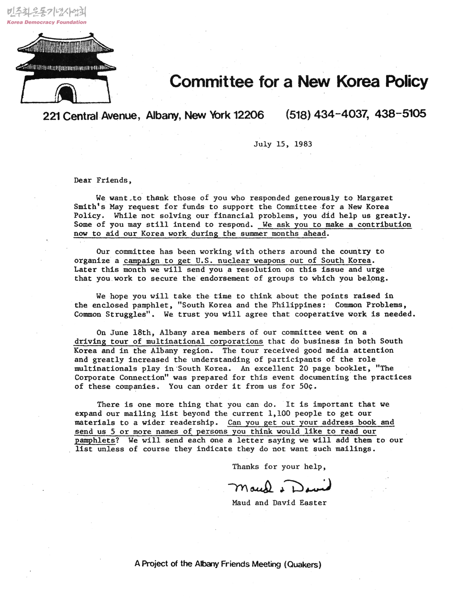 - 새로운한국정책위원회에 기부금 후원해준 것과 관련하여 Magaret Smith에게 감사를 전하고, 미국의 한국내 핵무기 반대하는 캠페인에 관한 소식과 한국과 필리핀의 투쟁에 관한 팜플렛 작성에 대한 이야기 등을 전함