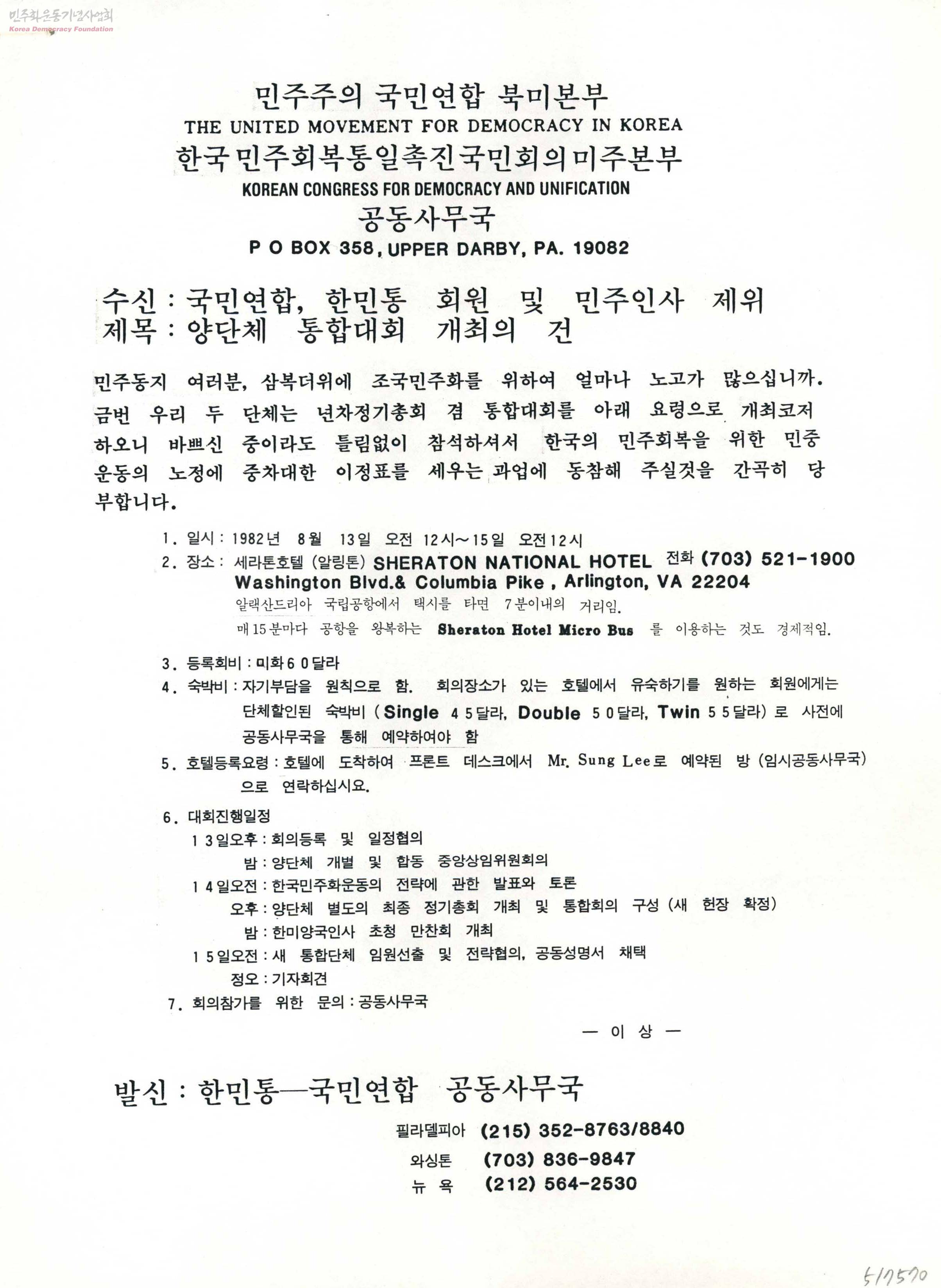 민주주의 국민연합 북미본부 한국 민주회복통일촉진국민회의미주본부 공동사무국-양단체 통합대회 개최의 건