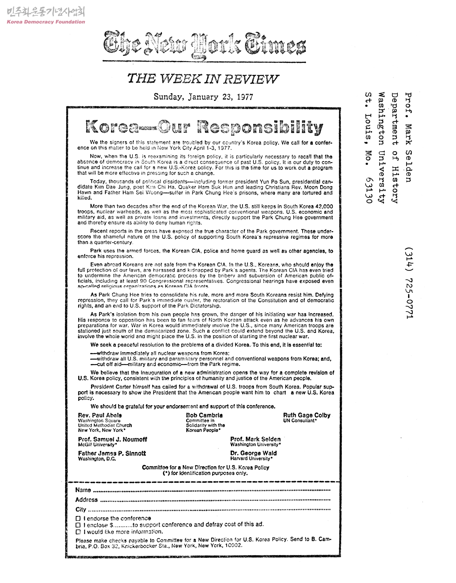 - 77년 한국 국민들이 민주화에 대한 요청으로 인하여 미국의 외국에 대한 새로운 정책의 필요성을 강조하며 한국국민들의 평화와 민주화에 대한 열망을 반영하여 한국에서의 핵무기 금지 및 주한미군의 철수등을 촉구하는 내용
