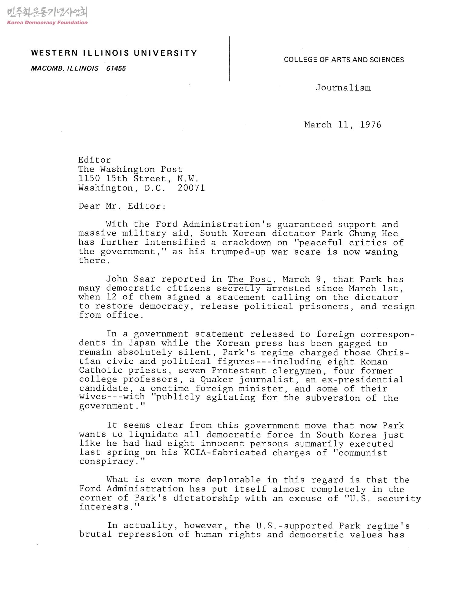 [박정희 정권과 미국의 관계 관련 우려의 글][수신:Washington Post]