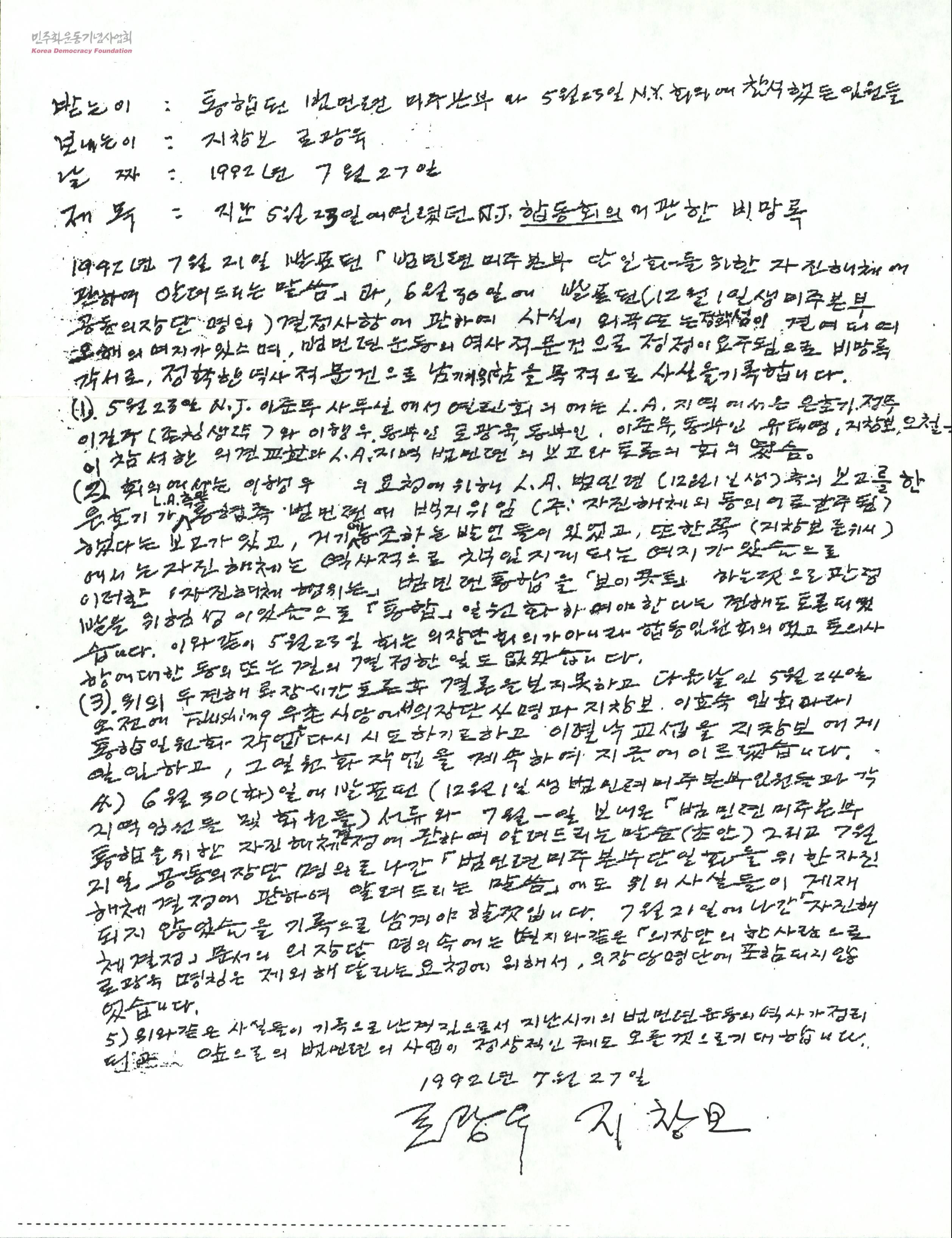 편지[로광욱,지창보 선생님이 통합된 범미련 미주본부와 5월23일 N.Y회의에 참석했던 임원들에게 보내는 비망록