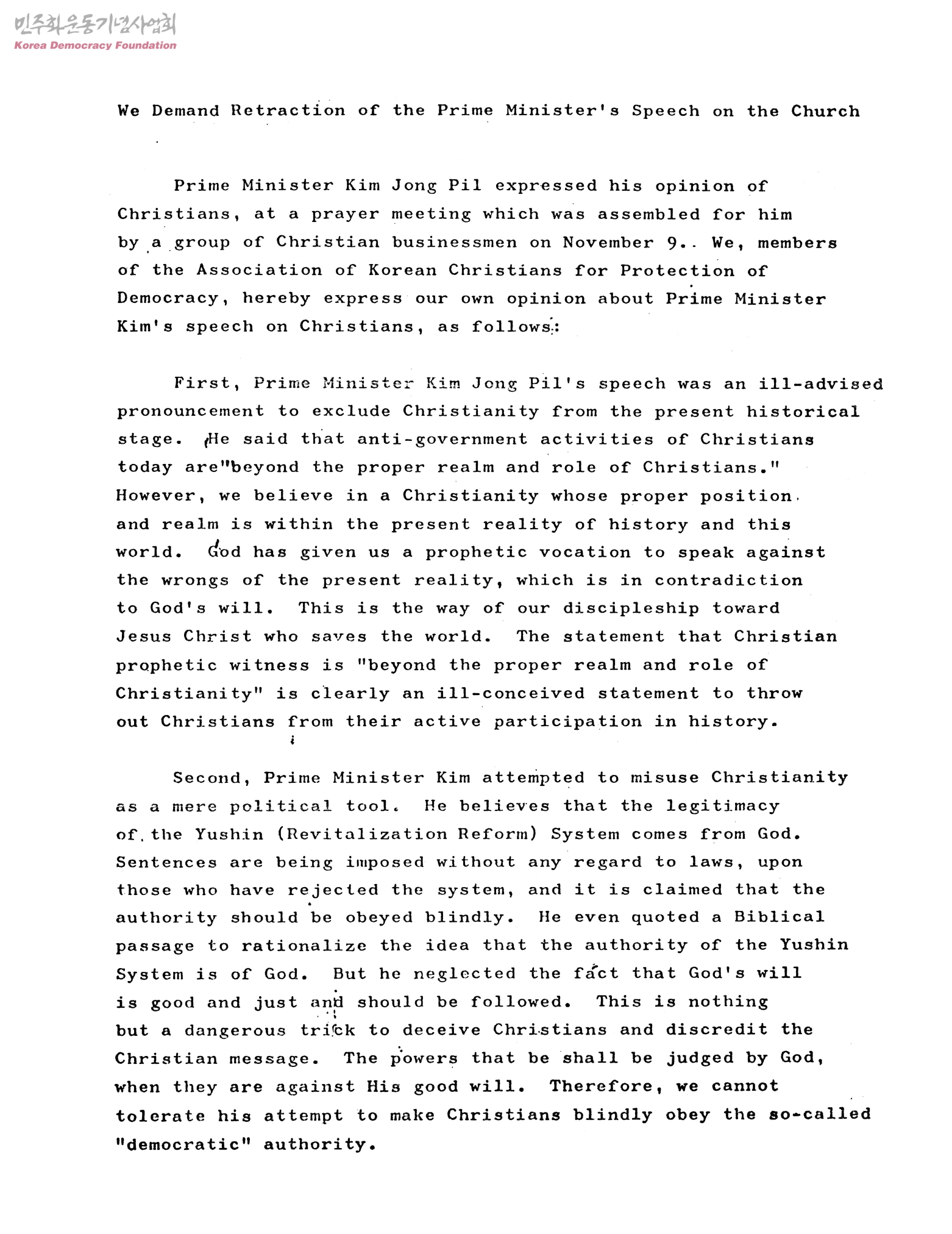 - 교회에서 있을 국무총리 연설의 철회를 요구하는 문서