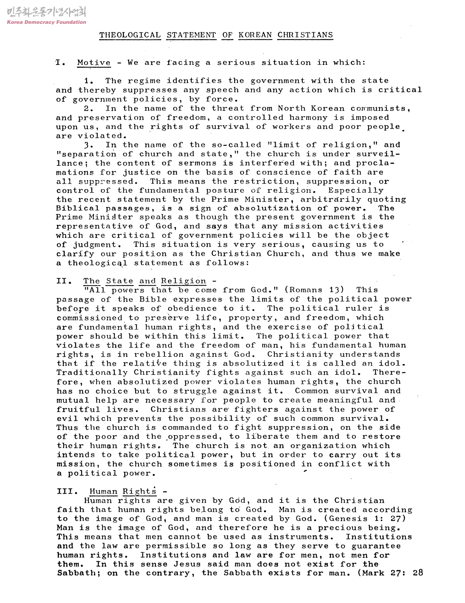 - 한국그리스도인의 신학적 성명-제도나 법은 인권을 봉사하는 한에서 인정되며, 절대화된 권력이 인간의 권리를 유린할 때 그리스도 교회는 그것에 대해 투쟁을 감행할 수 밖에 없다고 선언하여 사회참여에 대한 신학적 입장을 밝힘.