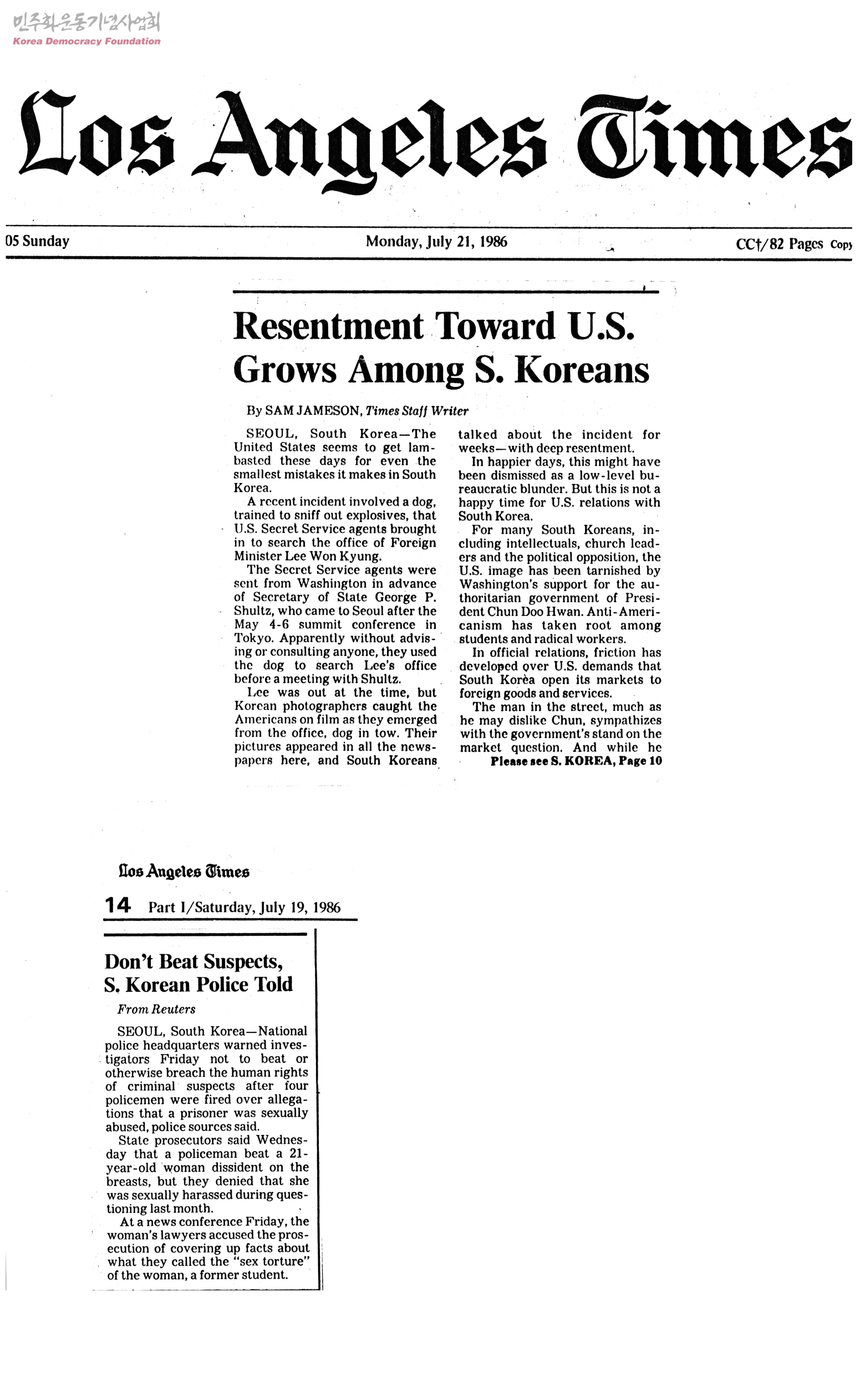 - 80년대 군사쿠데타로 정권을 장악한 전두환의 정책 및 미국과의 관계 등에 관한 기사와, 이에 반대하는 민주사회로의 이행을 촉구하는 야당 지도자 김대중 및 운동세력에 관한 내용의 기사 모음.