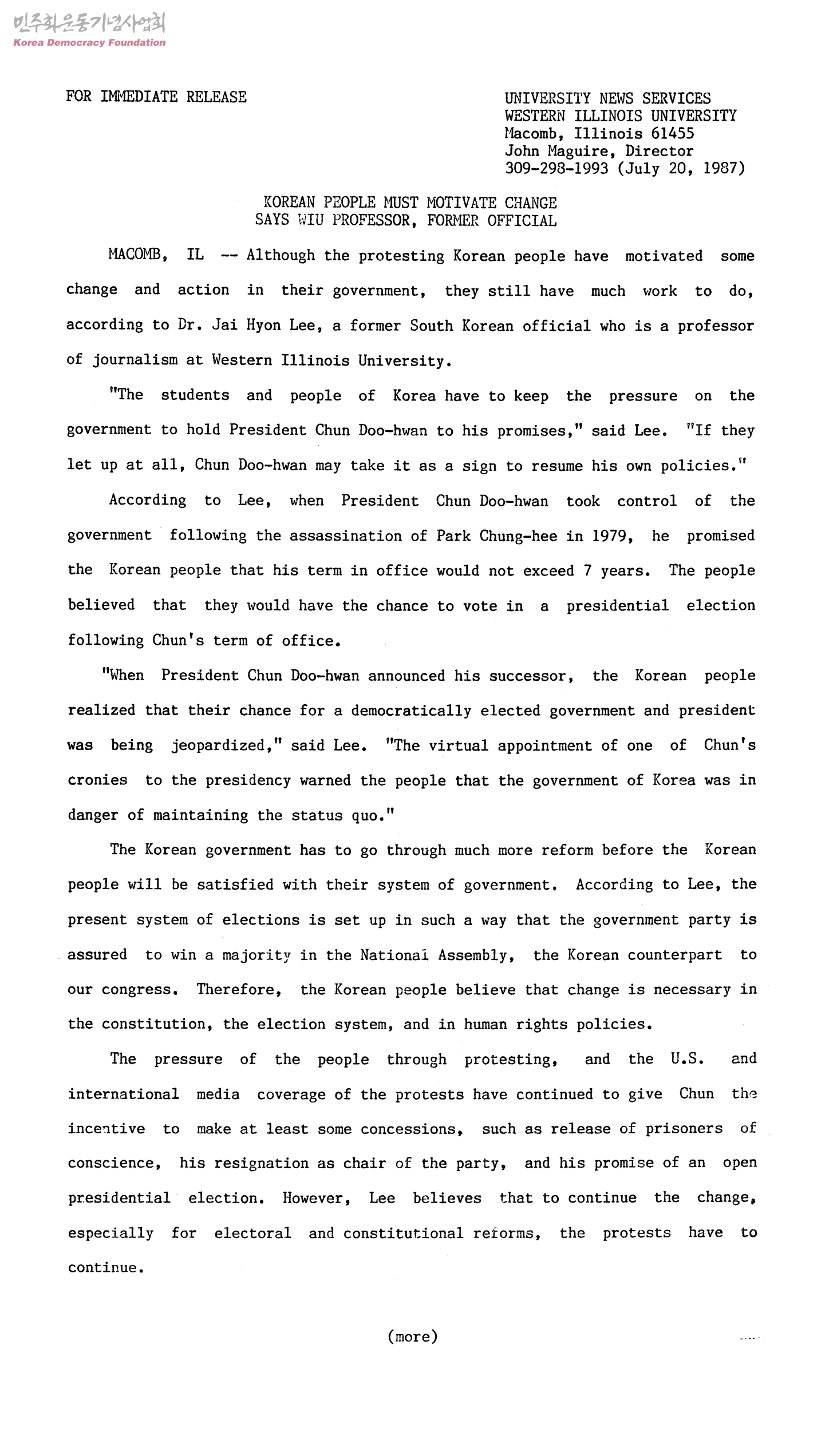 KOREAN PEOPLE MUST MOTIVATE CHANGE SAYS WIU PROFESSOR, FORMER OFFICIAL