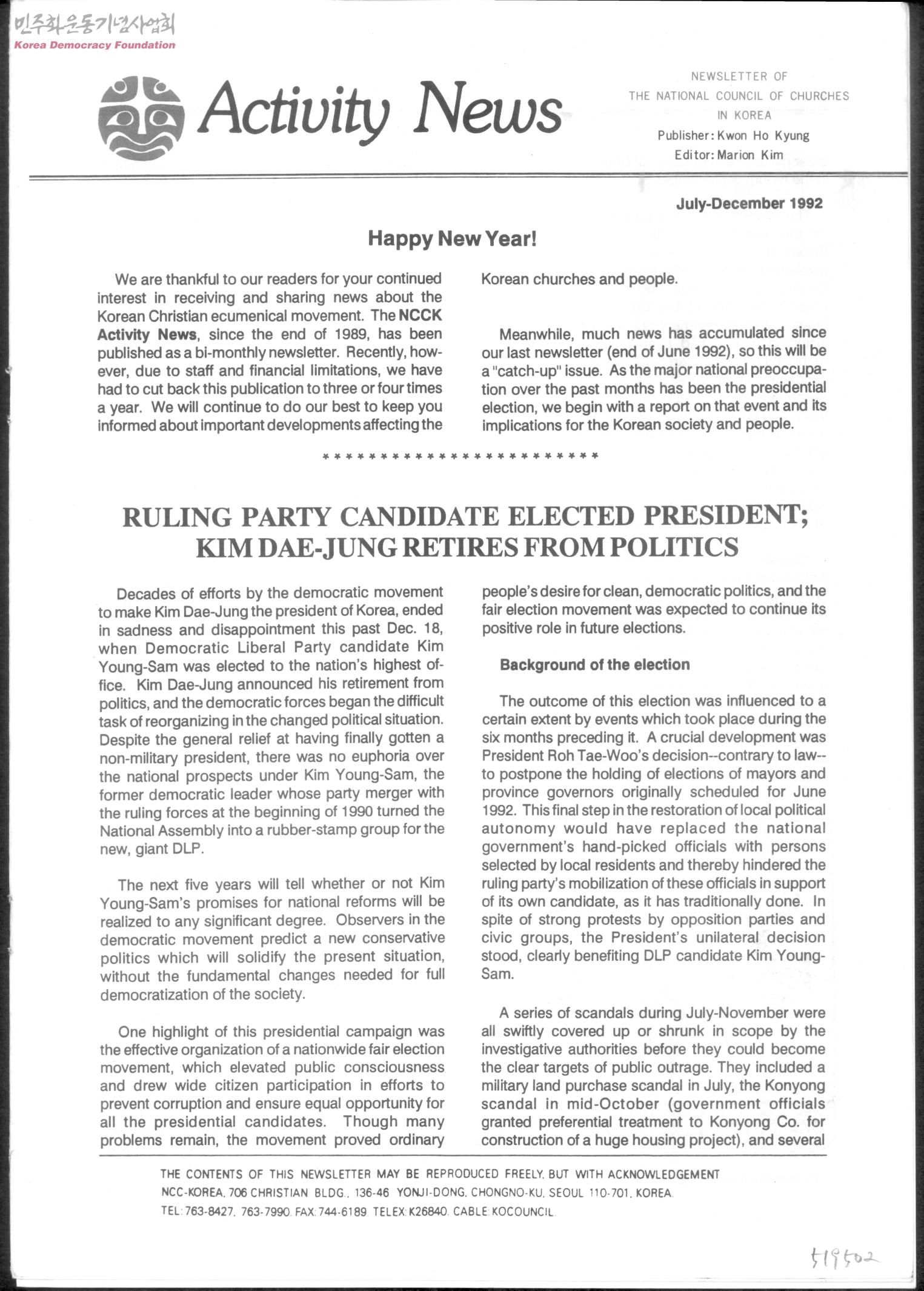 - Happy New Year! Ruling Party Candidate Elected President Toward the Jubilee : REunification News REflections of a Long-term Prisoner "Hyoshik's Rose" First visit from Church of China Women's News Ecumenical Visit to Los Angeles Human Rights Conditions Worsening MBC Strike Strengthenes Unity