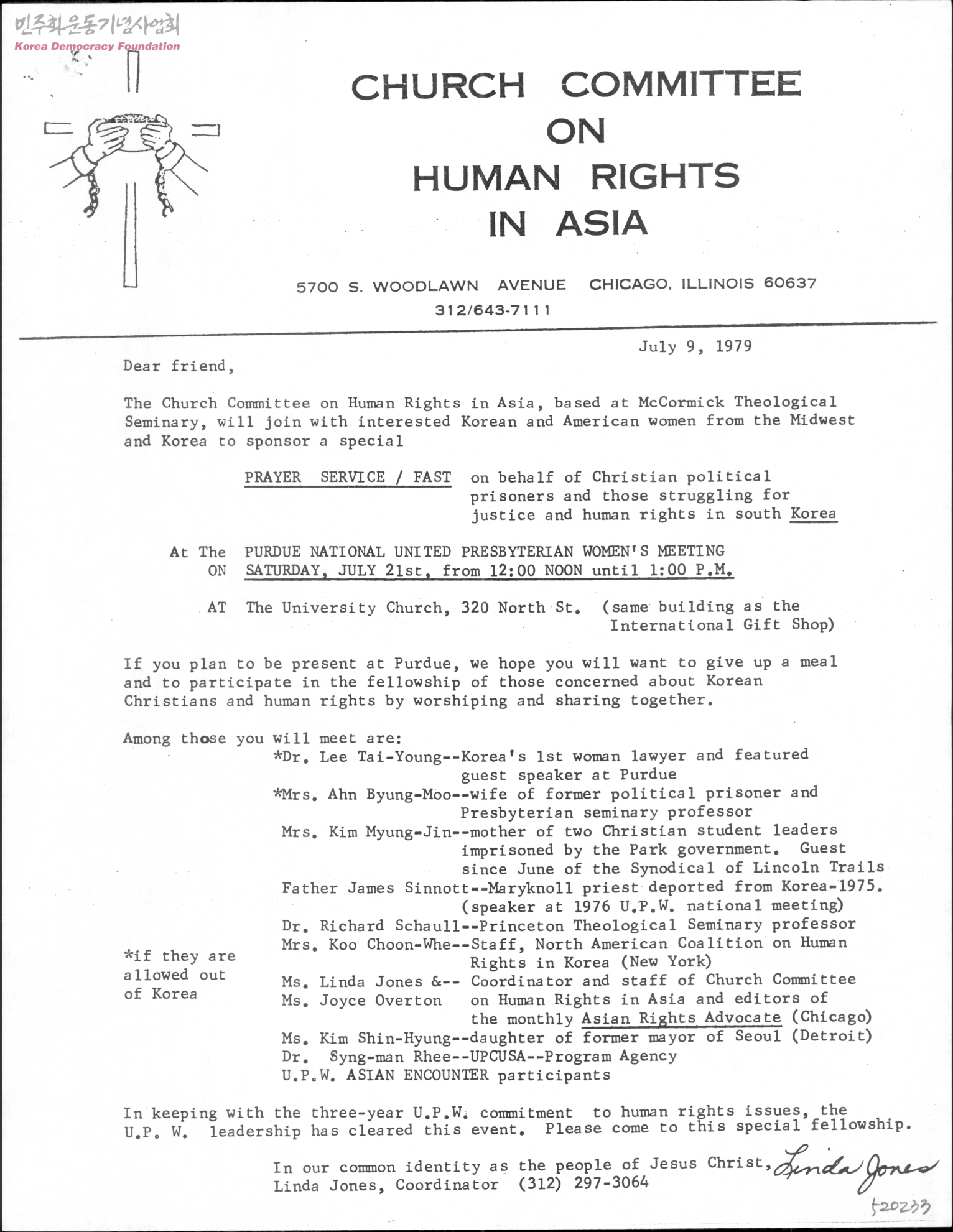 - 한국의 기독교인 정치범의 석방과 정의/평화를 위한 투쟁을 위해 아시아교회인권협의회에 안내하는 기도회