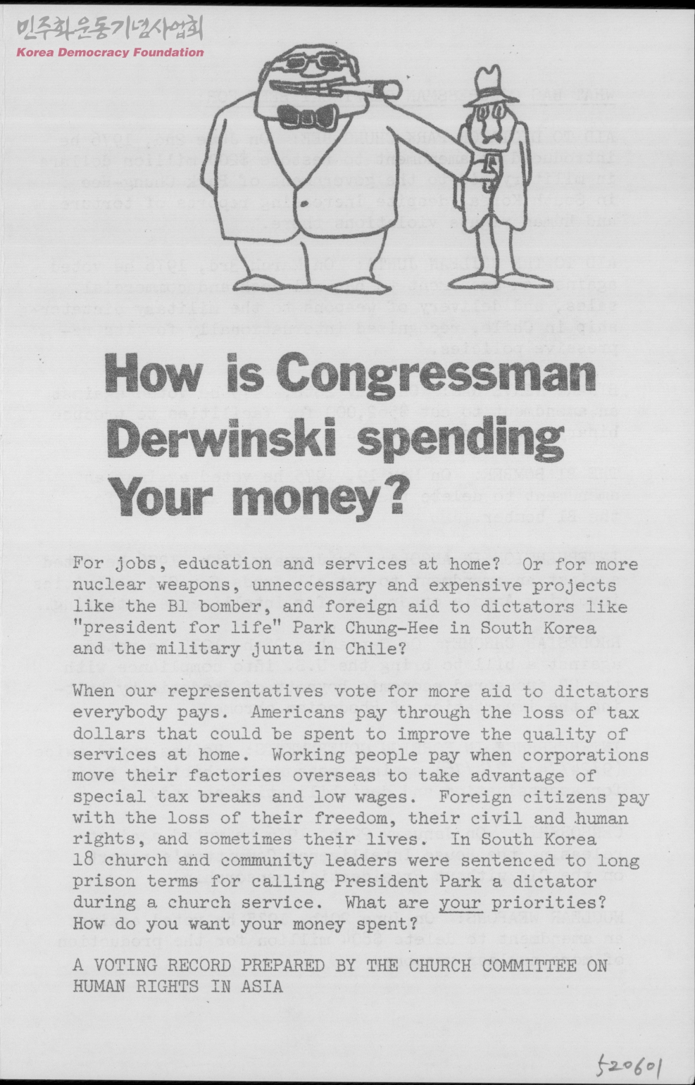 - What has congressman Derwinski been for - aid to dictator Park Chung-hee - aid to the chilean junta - binary nerve gas - the BI bomber - intervention in Angola 등 What has congressman Derwinski been against - social security - jobs - consumer protection - education - firefighters benefits 외.