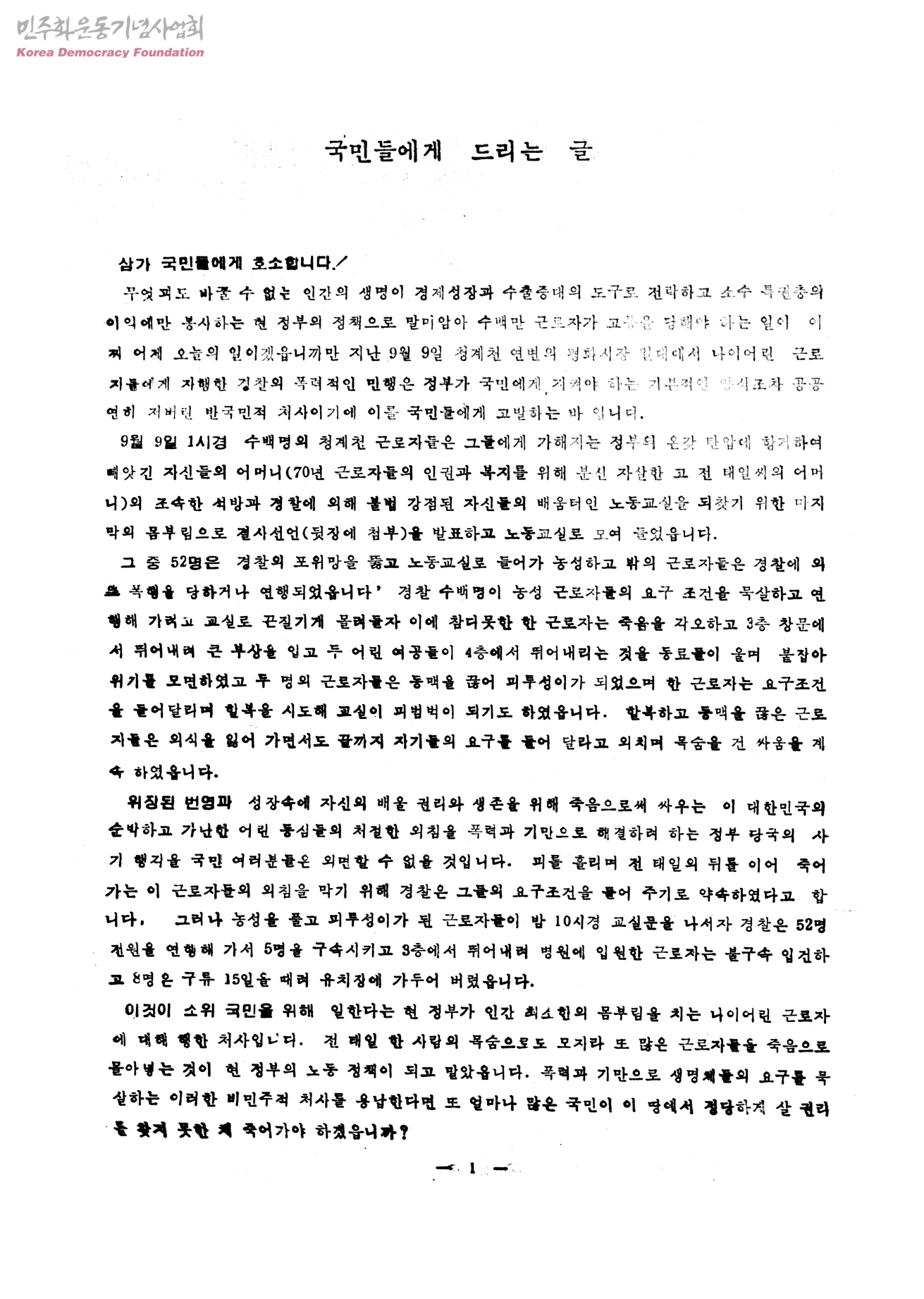 - -국민들에게 드리는 글(1977.09.20) -결사(決死)선언(1977.09.09) -평화시장 노동자들 「죽음의 항쟁」에 나서다.(1977.09.09)