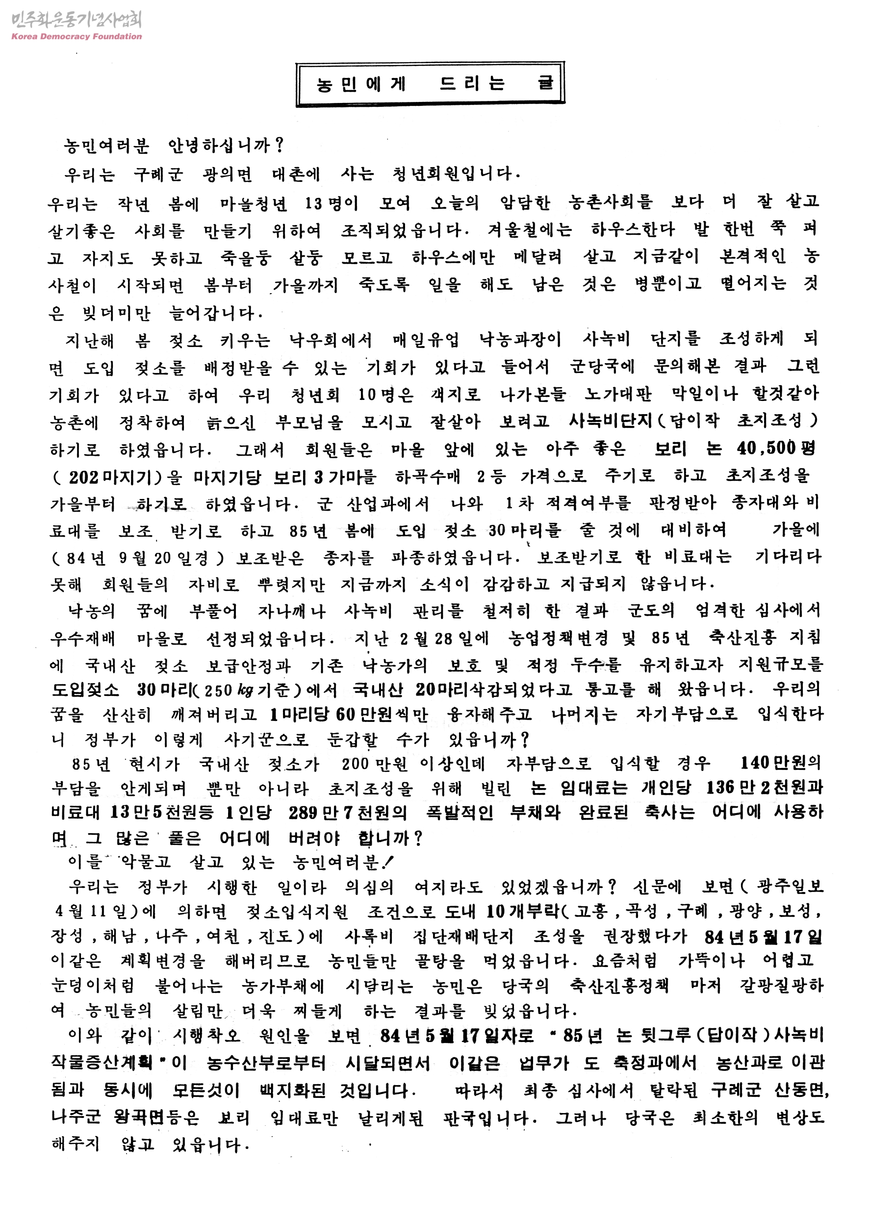 농민에게 드리는 글 [구례군 광의면 대촌 사녹비 단지로 인한 피해와 관련한 글]
