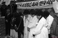 - 대우자동차에서 임금인상을 요구하며 농성을 주도했다는 이유로 구속된 8명의 구속자가족이 당국의 처사에 대해 질의함
