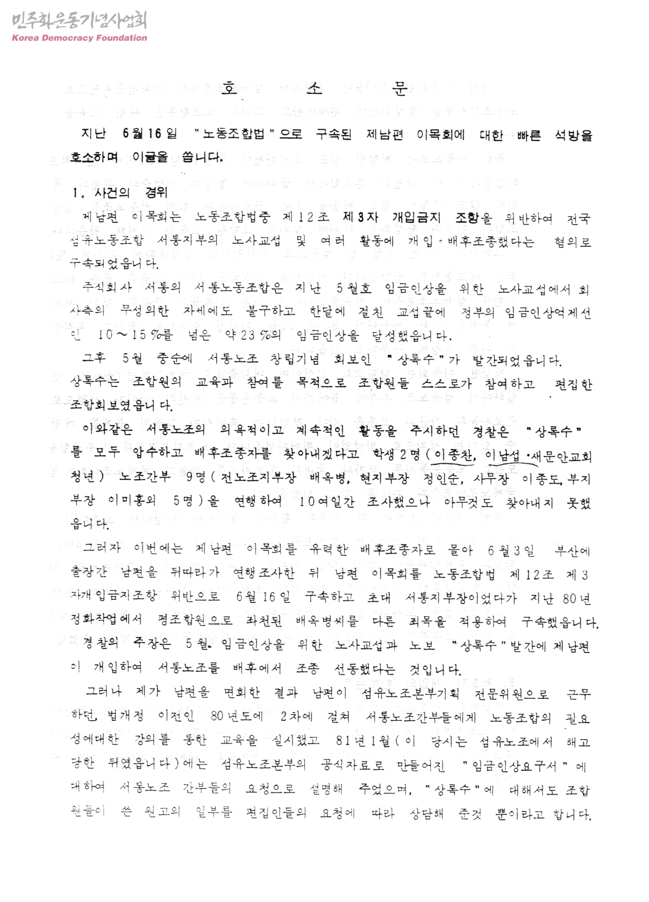 호소문[지난 6월16일 노동조합법으로 구속된 제 남편 이목희에 대한 빠른 석방을 호소하며]