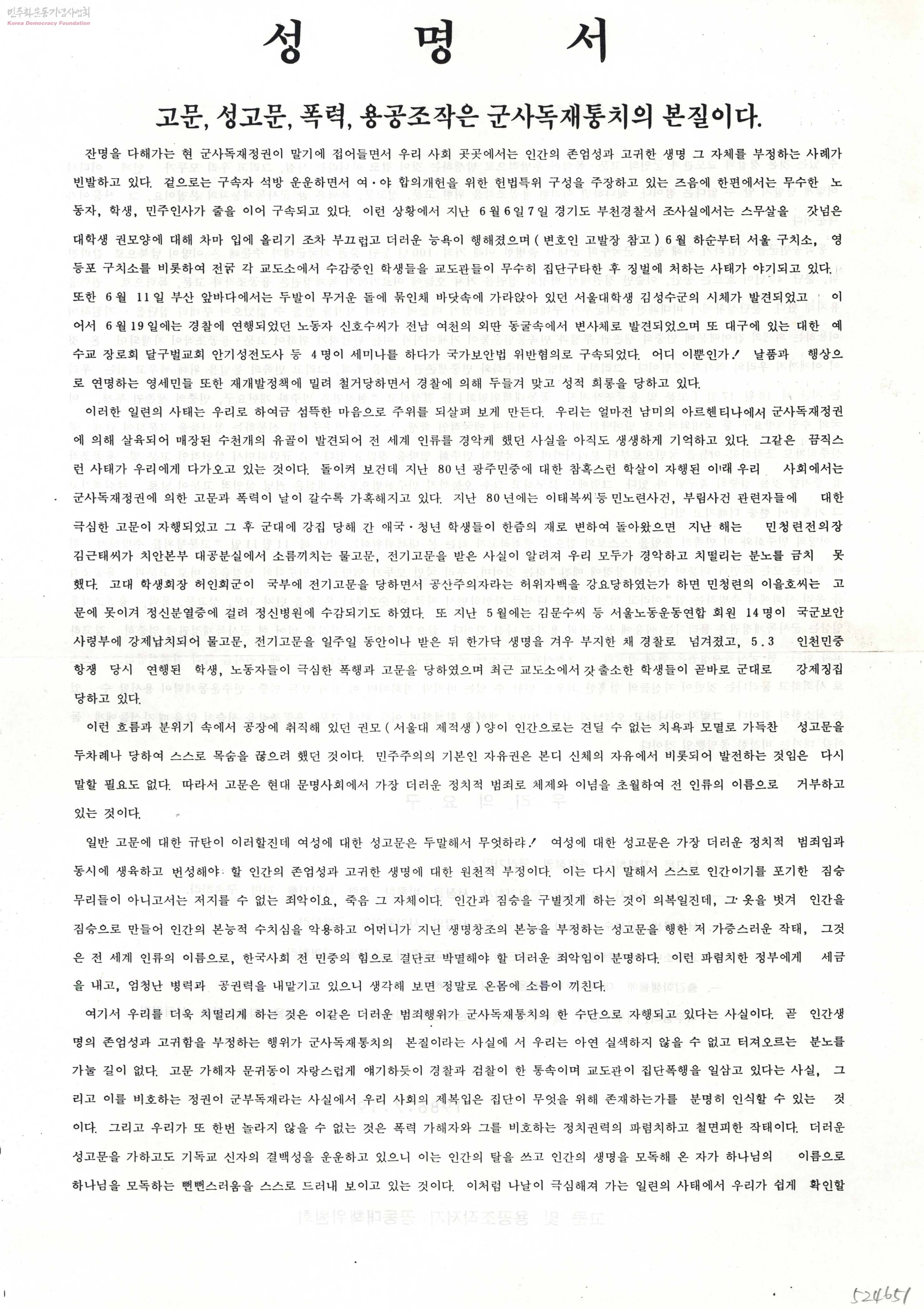 성명서-고문,성고문,폭력,용공조작은 군사도개통치의 본질이다.