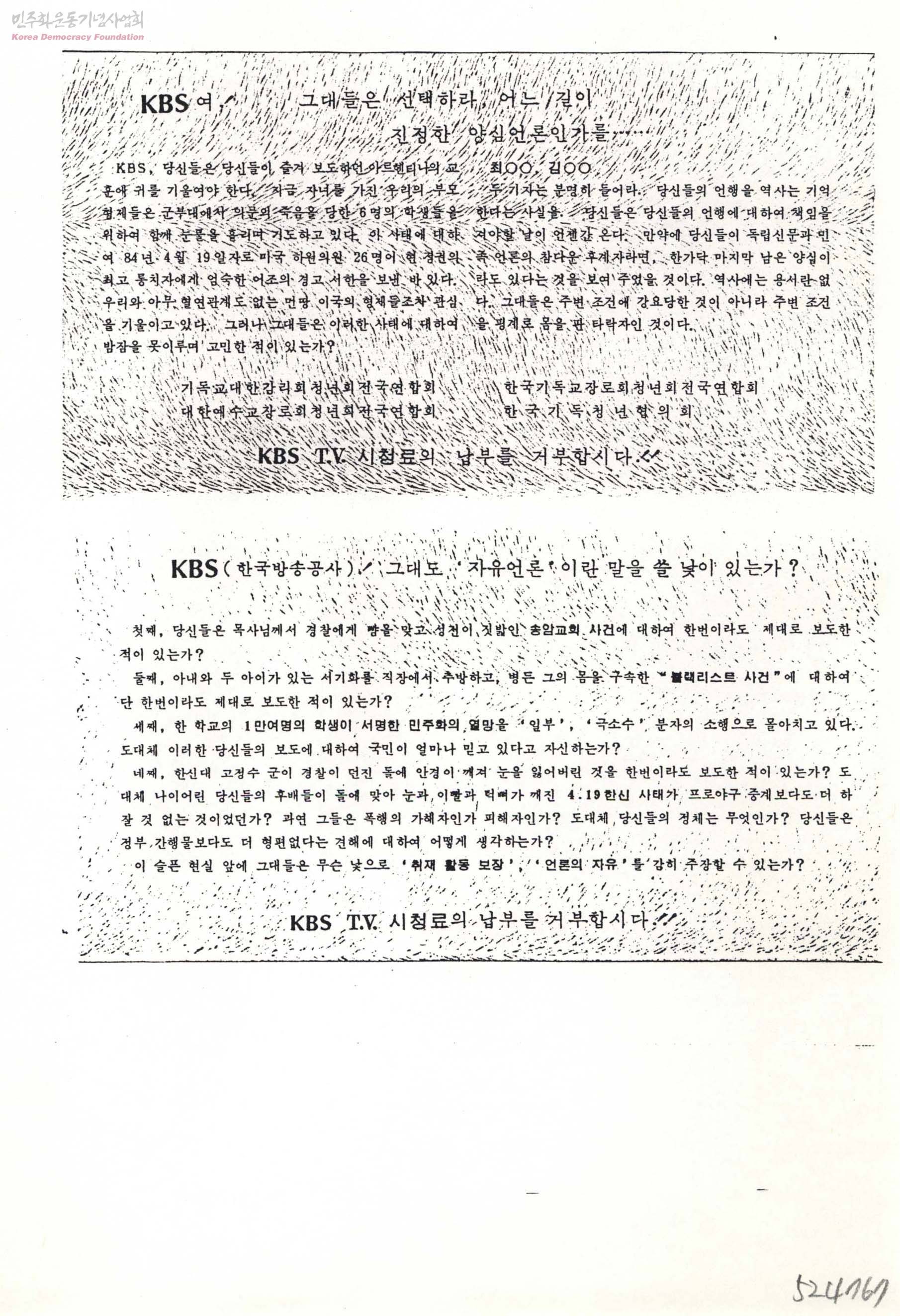 - 80년대 어용화된 KBS 공영방송의 문제점을 비판하고, 시민들의 행동을 통해 권력과 자본으로부터 독립된 공정한 언론매체가 되도록 일련의 개혁이 이루어져야 함을 주장했던 'KBS-TV 수신료 거부운동' 관련 내용 KBS여! 그대들은 선택하라, 어느 길이 진정한 양심언론인가를 KBS(한국방송공사)! 그대도 '자유언론'이란 말을 쓸 낯이 있는가? 등