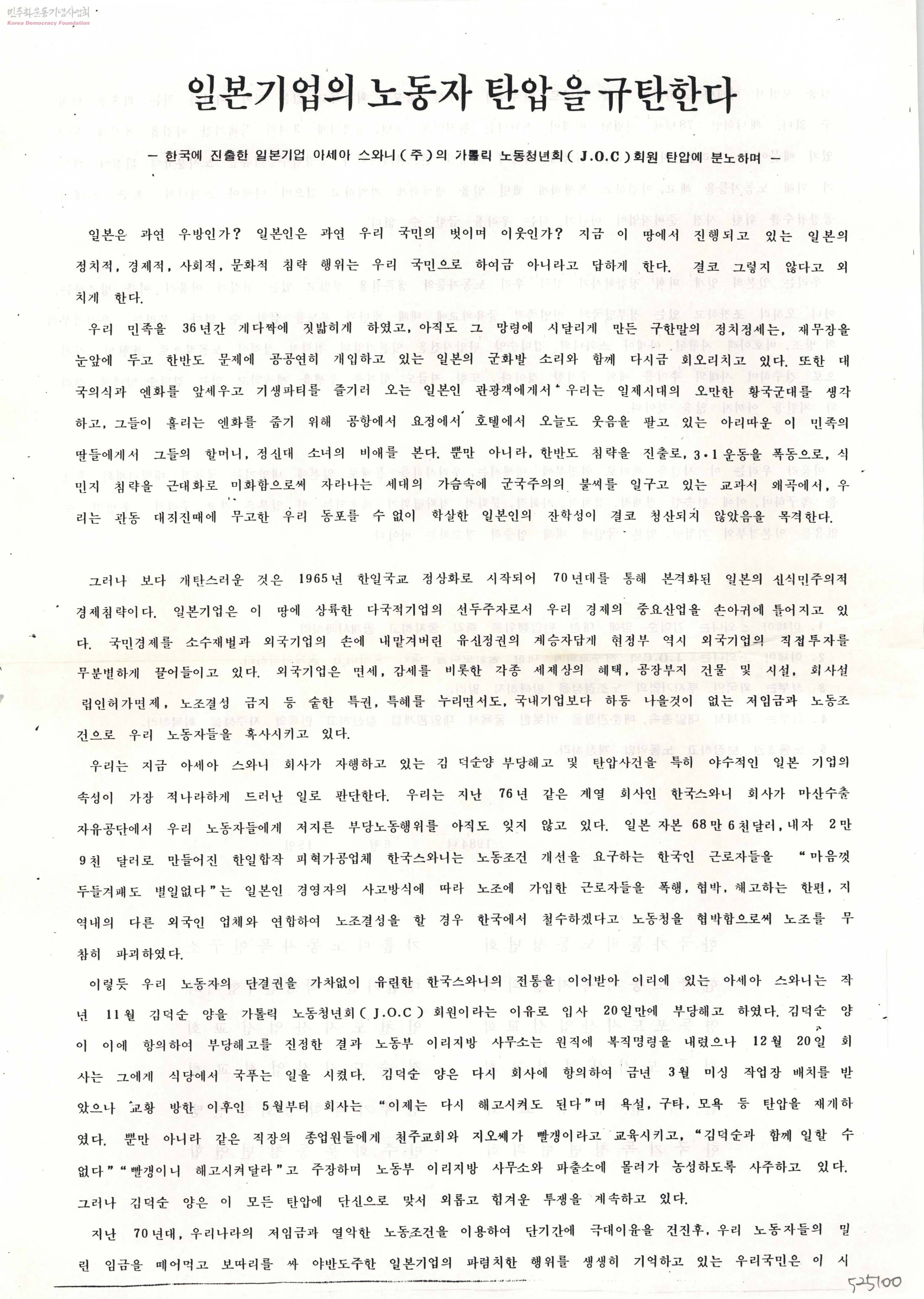 - -한국에 진출한 일본기업 아세와 스와니(주)의 가톨릭 노동청년회(J.O.C)회원 탄압에 분노하며- 1. 아세아 스와니는 김덕순 양에 대한 탄압행위를 즉각 중지하고 공개사과하라. 2. 아세아 스와니는 J.O.C와 천주교회에 대한 중상모략을 즉각 중지하고 공개사과하라. 등의 내용