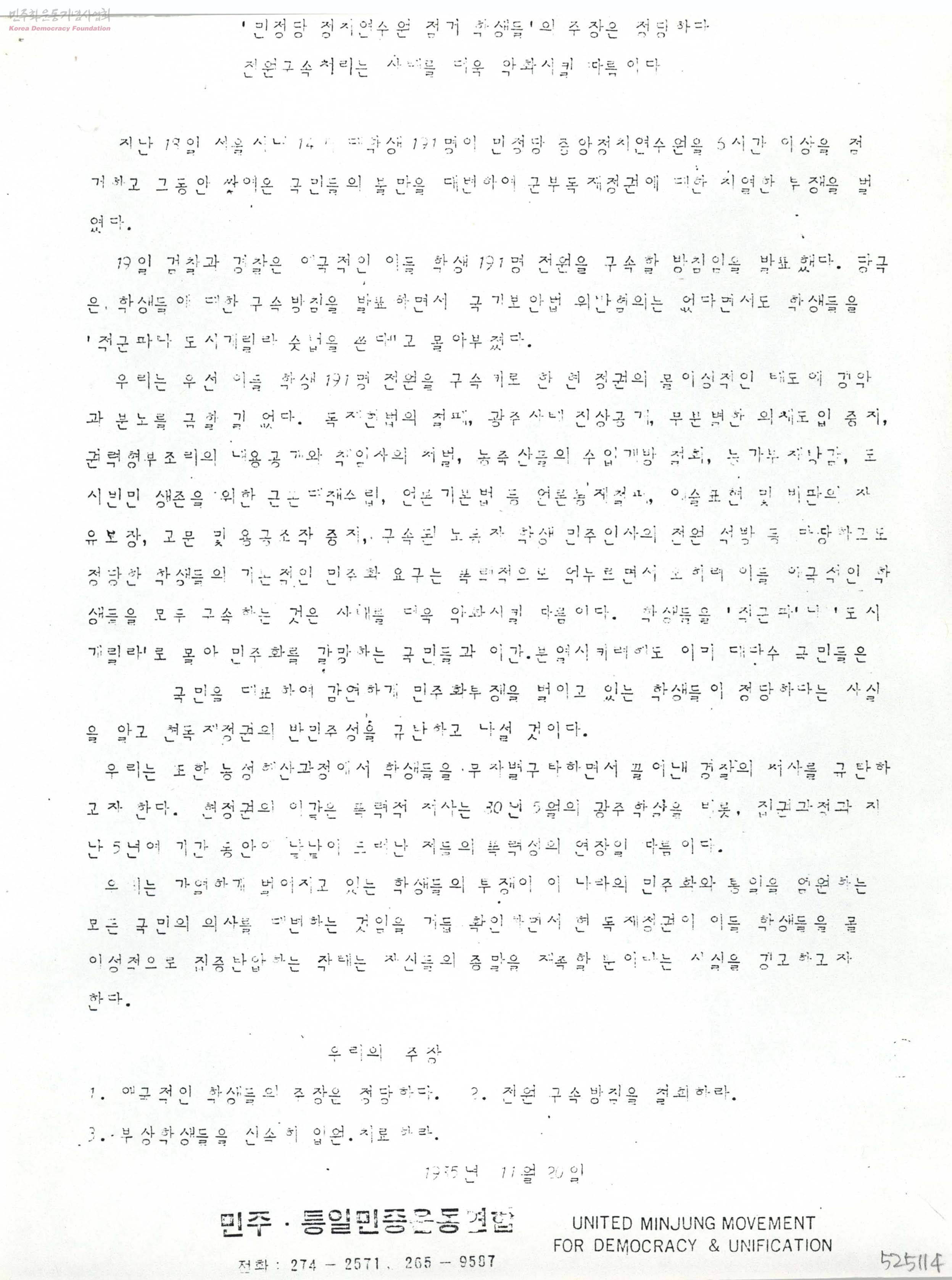 - 우리의 주장 1. 애국적인 학생들의 주장은 정당하다. 2. 전원 구속방침 철회하라. 3. 부상학생들을 신속히 입원 치료하라.