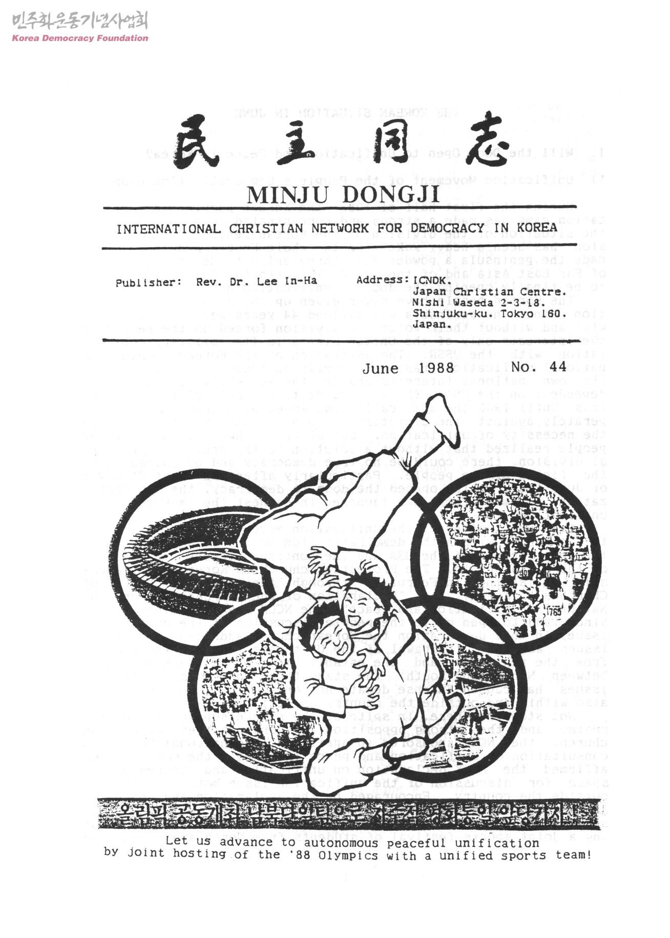 - 1973년 4월 한국의 민주화를 위한 국내 국외에 있던 기독교인들이 '한국그리스도인의 신앙선언'준비 계기로 모여 4년 뒤 뉴욕회의에서 탄생한 한국민주화기독자동지회가 발행한 민주동지 44호로 한국민중들이 통일에 대한 염원이 높다는 사실과 통일운동의 앞으로의 전망 등에 대해 정리한 글이 수록된 소식지.