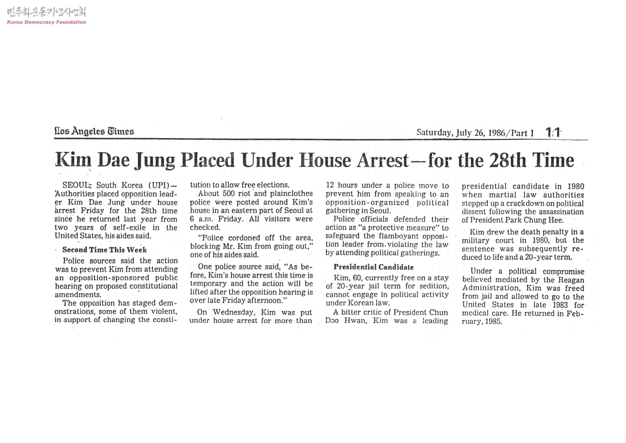 [신문스크랩]Kim Dae Jung Placed Under House Arrest - for the 28th time