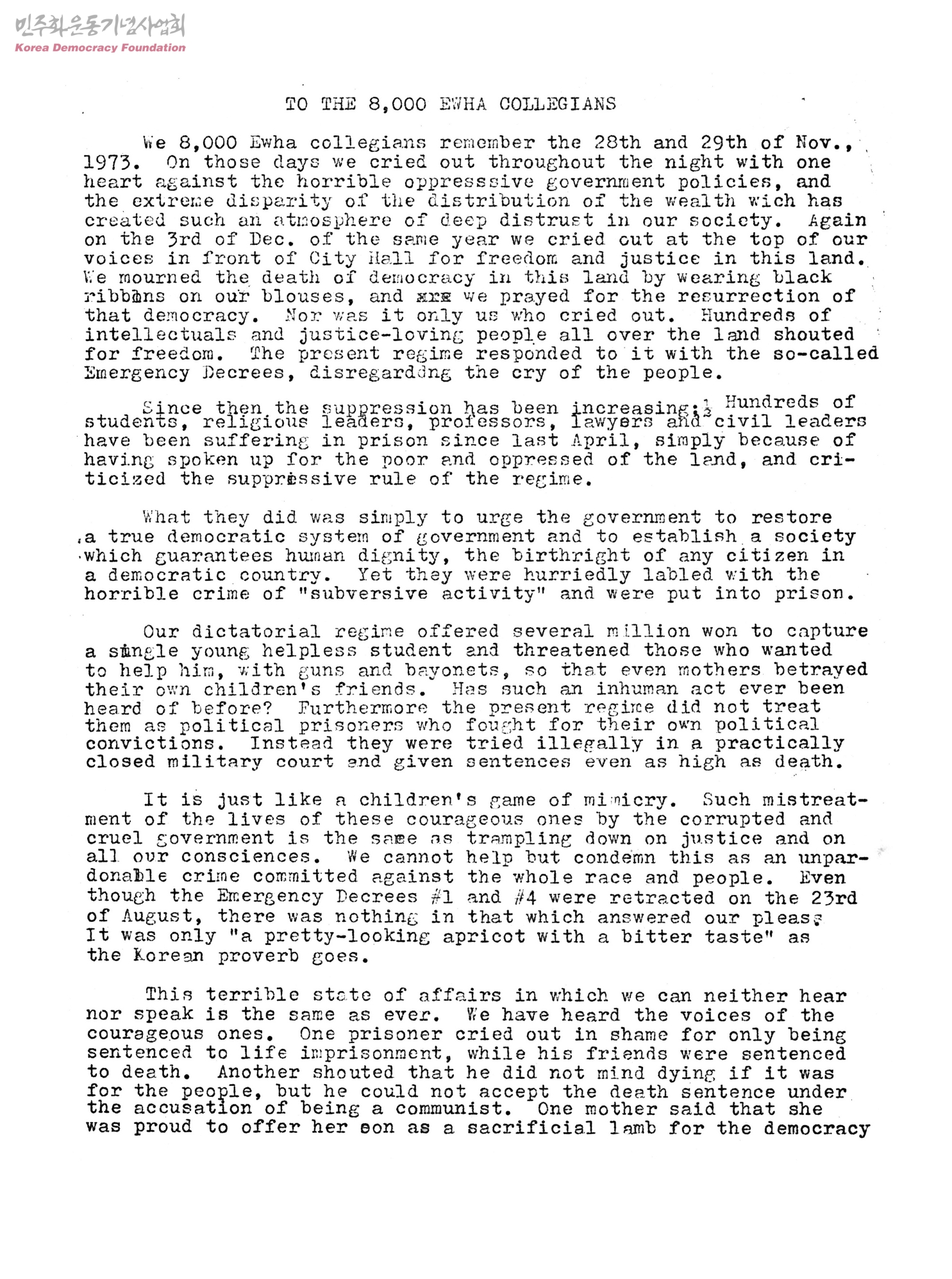 - We 8,000 Ewha collegians remember the 28th and 29th of Nov., 1973. On those days we cried out throughout the night with one heart against the horrible oppressive government policies