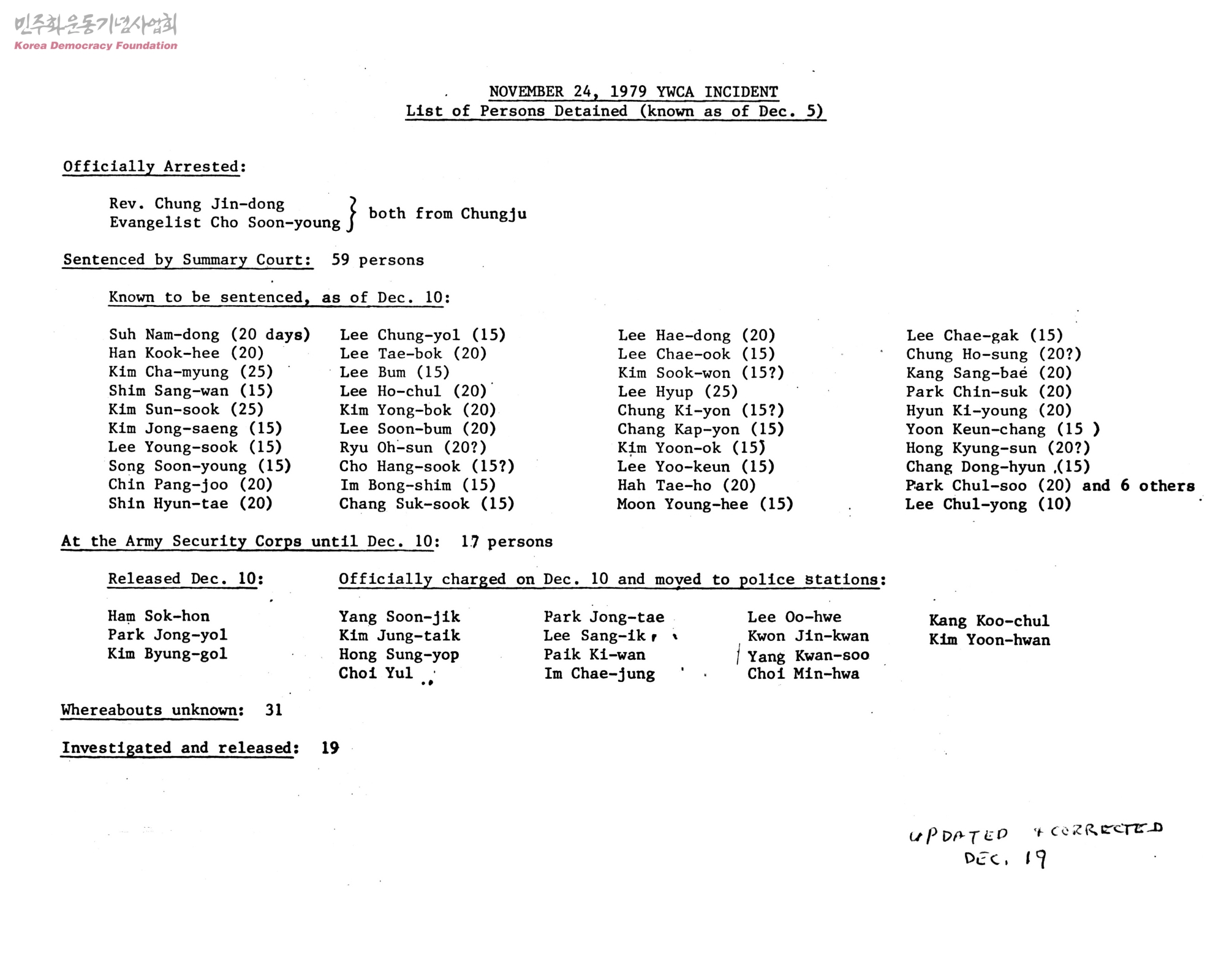 - Sentenced by Summary Court : 59 persons At the Army Security Corps until Dec. 10 : 17 persons Whereabouts unknown : 31 persons Investigated and released : 19 persons