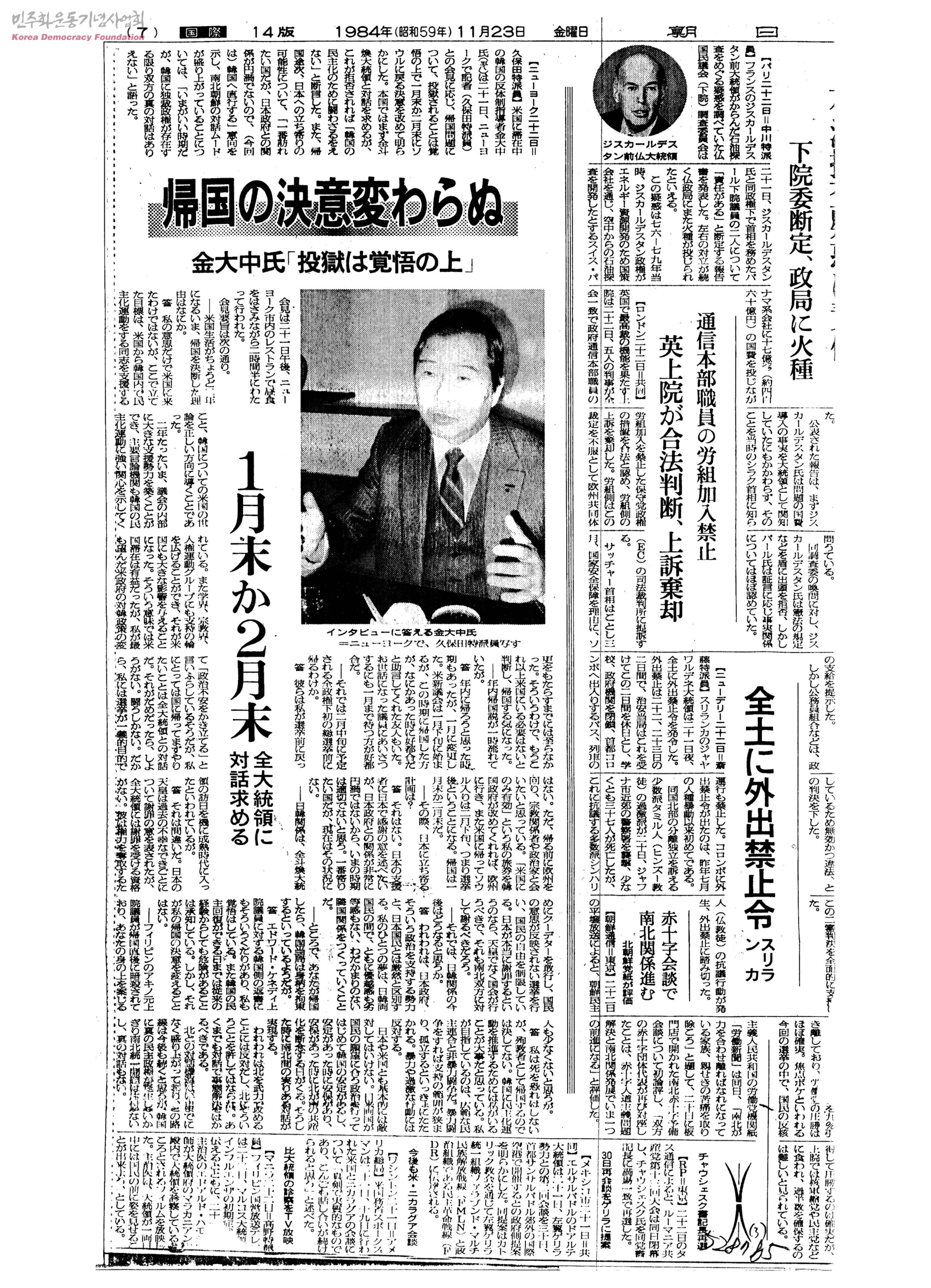 [신문스크랩]歸國の決意變わらぬ-金大中氏「投獄は俉の上」