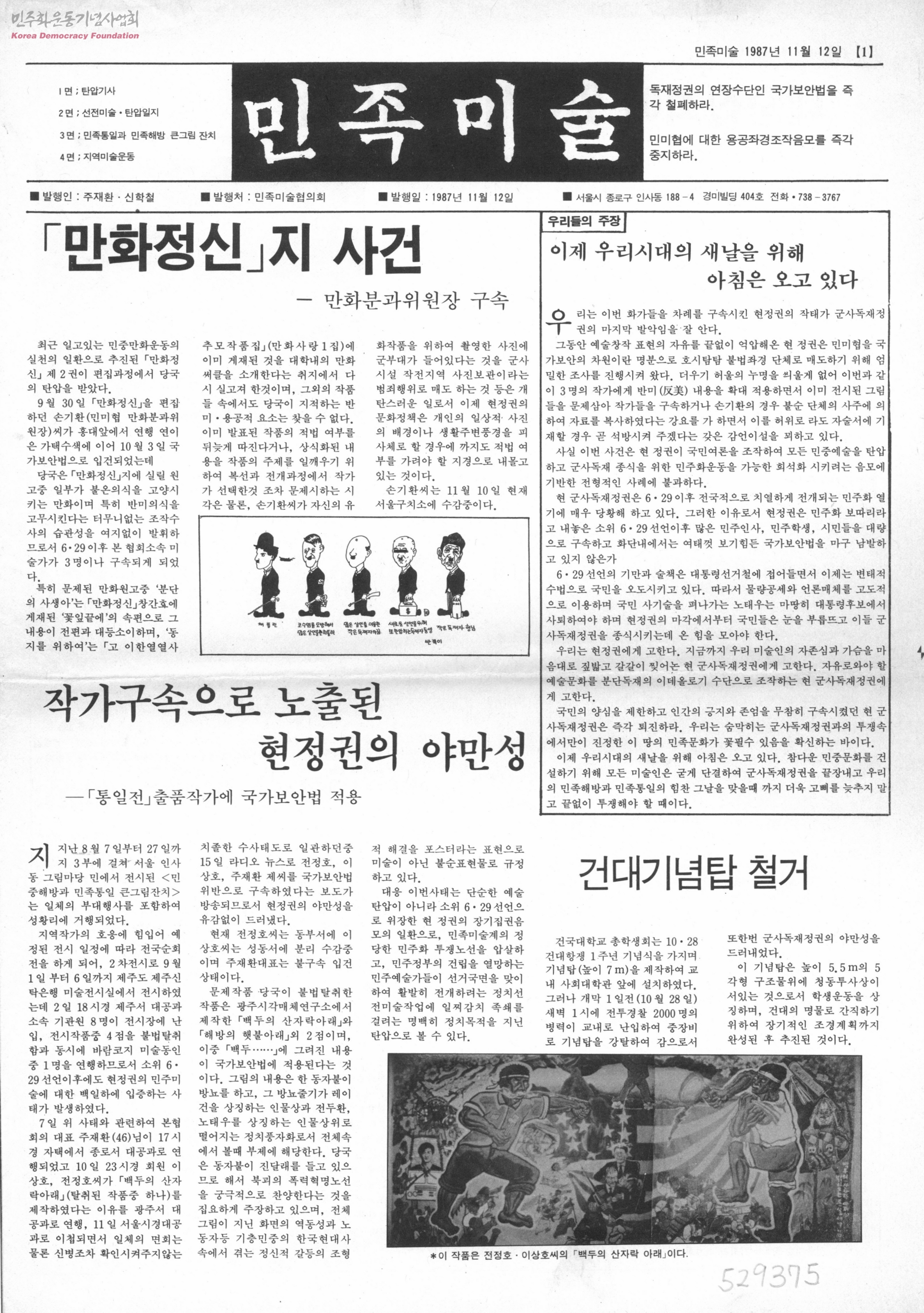 - '만화정신'지 사건 작가구속으로 노출된 현정권의 야만성 건대기념탑 철거 등...