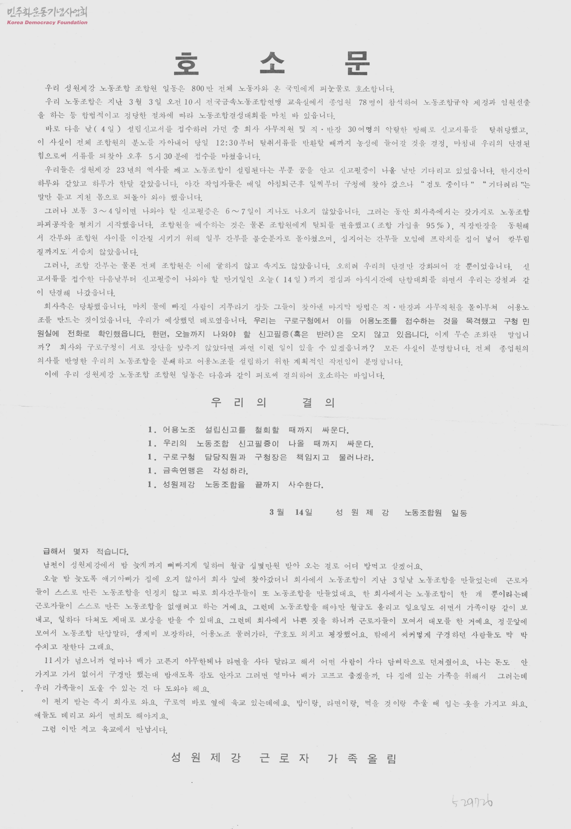 - 호소문[성원제강노조 탄압에 관한 내용] - 어용노조 설립신고를 철회할 때까지 싸운다 - 우리의 노동조합 신고필증이 나올 때까지 싸운다 - 금속연맹은 각성하라