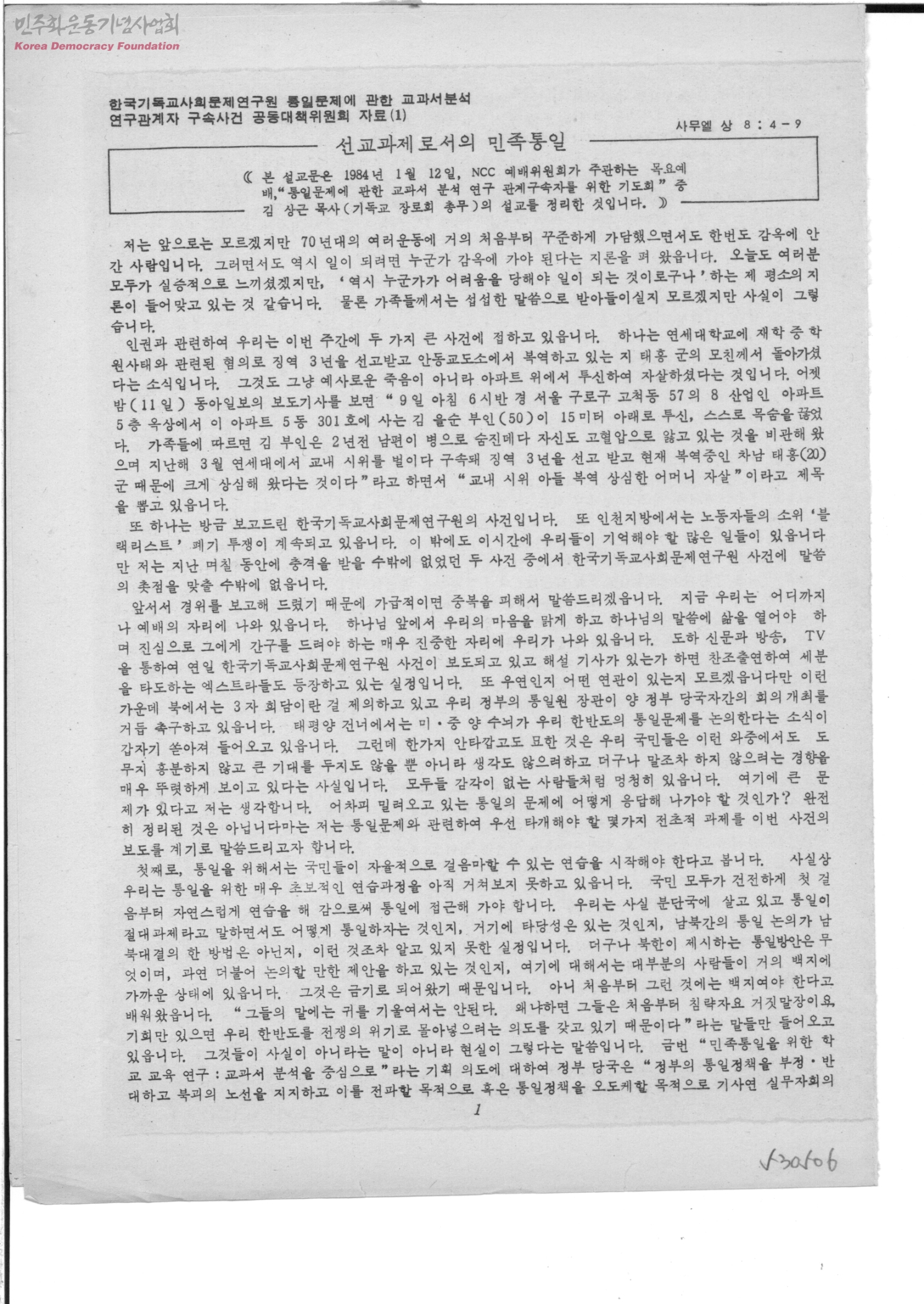 - 본 설교문은 1984-01-12, NCC 예배위원회가 주관하는 목요예배, "통일문제에 관한 교과서 분석 연구 관계구속자를 위한 기도회"중 김상근목사(기독교 장로회 총무)의 설교를 정리한 것.