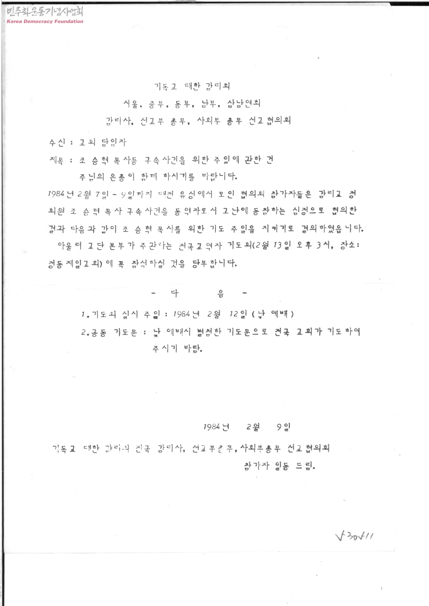 - 조승혁 목사 구속사건과 관련한 전국 교역자 기도회 안내 및 참석 부탁의 공문