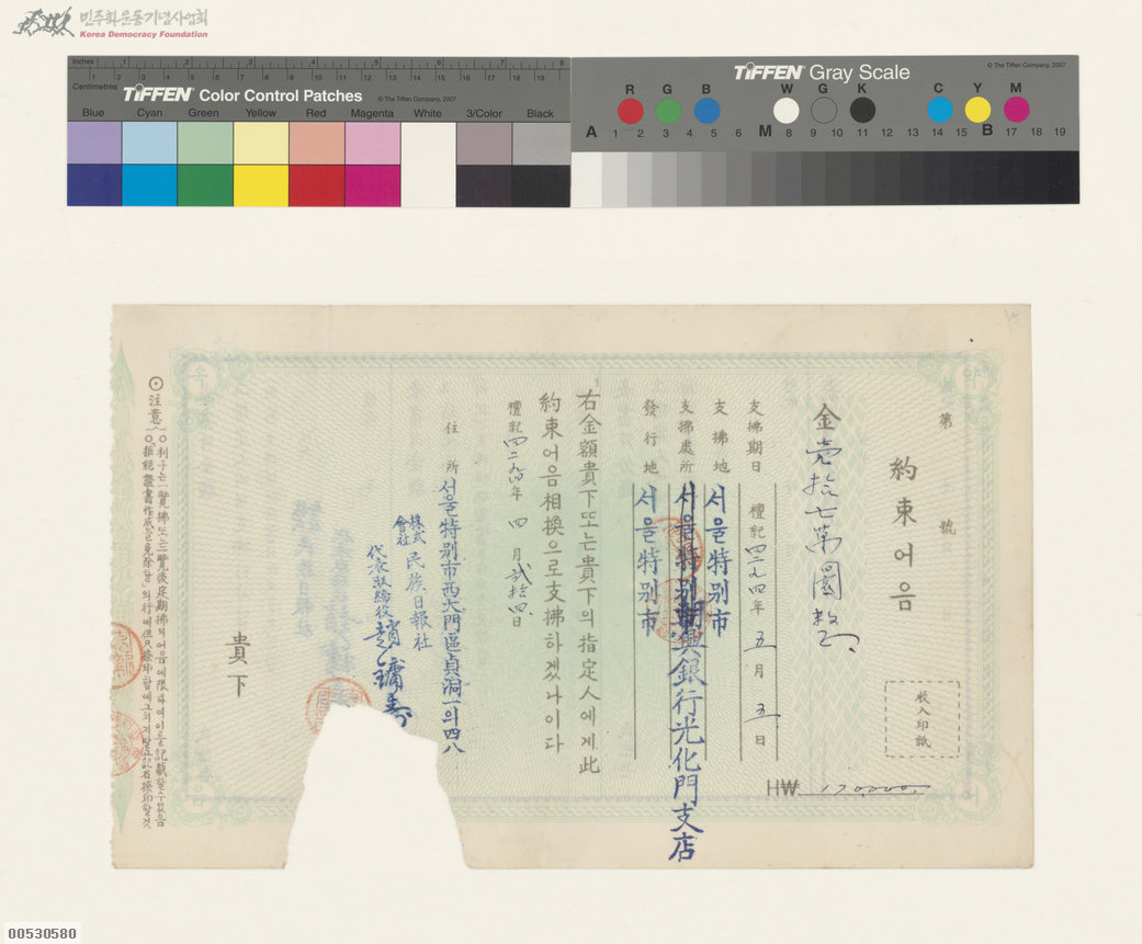 - 민족일보사가 1961년 5월 폐간되기 전 거래처에 대금 지불용으로 발행하였던 약속어음 묶음 국가기록원 맞춤형 복원·복제 지원(2025)