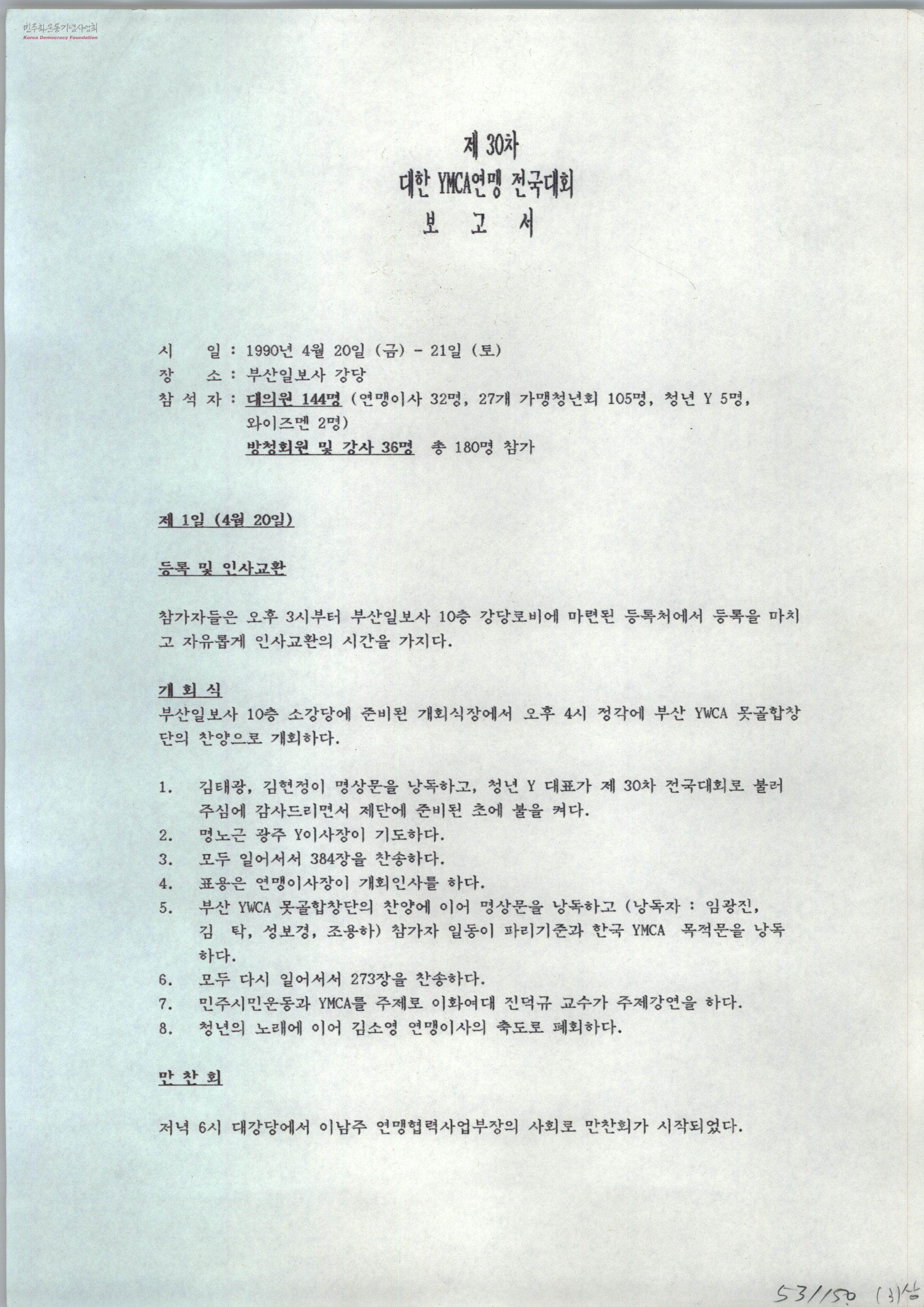 - 보고서및 사무회의록 한국YMCA 평화.통일 운동 선언 언론민주화의 현상황을 우려하며-최근 KBS사태에 대한 우리의 견해 제30차 대한기독교청년회연맹 전국대회 결의문 제30차 대한 YMCA연맹 전국대회 참가자 명단.
