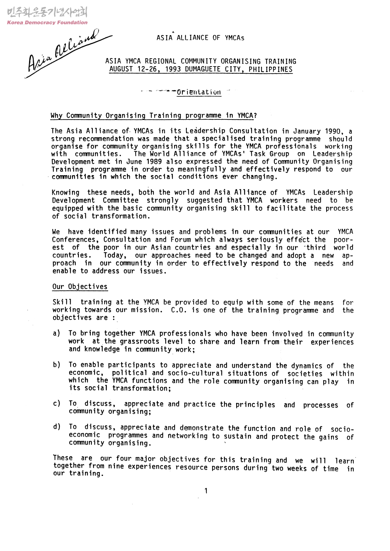 ASIA YMCA REGIONAL COMMUNITY ORGANISING TRAINING AUGUST 12-26, 1993 DUMAGUETE CITY, PHILIPPINES